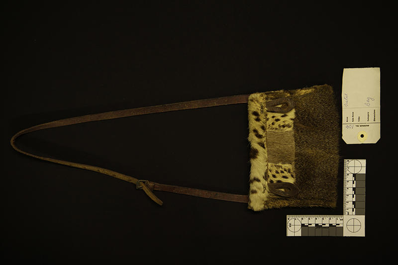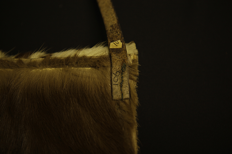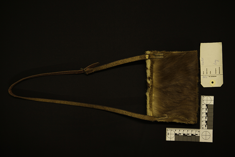 Transcription of entry in Accession Register (Ethnology Book 1) under no.106 [Source - Chiara Singh for FHYA, 2021: All text handwritten by F. W. Fitzsimons unless otherwise specified. Direct quotes are indicated in quote marks, with additions indicated in square brackets: "Native fur snuff-bag"; LOCALITY: "Natal"; SOURCE AND DATE: "Purchased". Other inscriptions: '19" [Meaning unknown"; "7/e/1" [Geographic area/community as per the category indicated on the Catalogue Card, which corresponds with "Natal / General"]; "C" [Meaning unknown"; Red tick [Relates to an audit conducted on the collection between 1958 and 1961].]