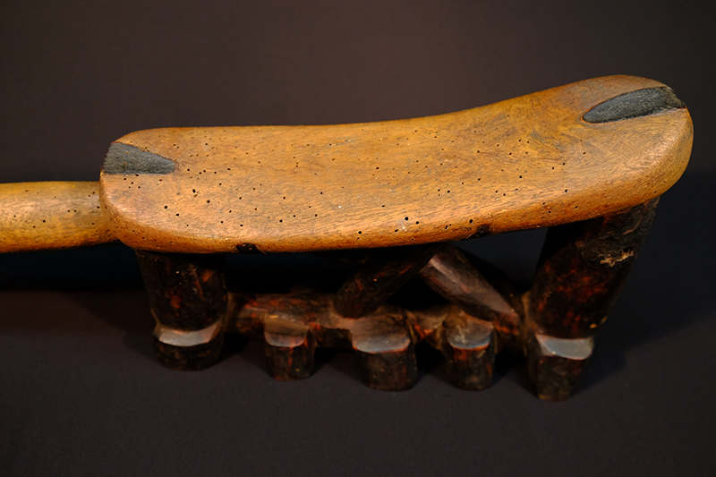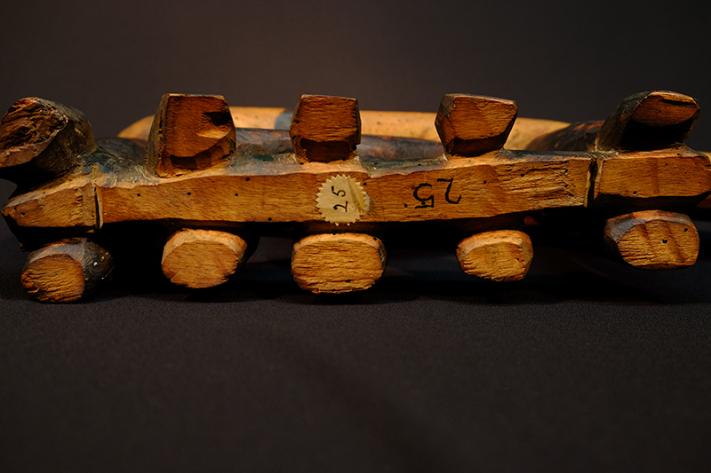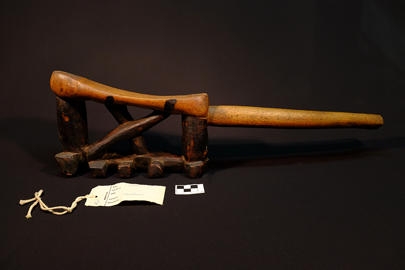 Transcription of entry in Accession Register (Ethnology Book 1) under no.25 [Source - Chiara Singh for FHYA, 2021: All text handwritten by F. W. Fitzsimons unless otherwise specified. Direct quotes are indicated in quote marks, with additions indicated in square brackets: "Native pillow"; REMARKS: "Treated with Woodprufe solution, September 1971"; LOCALITY: "Natal"; SOURCE AND DATE: "Presented". Other inscriptions: "7/e/1" [Geographic area/community as per the category indicated on the Catalogue Card, which corresponds with "Natal / General"]; "C" [Meaning unknown].]