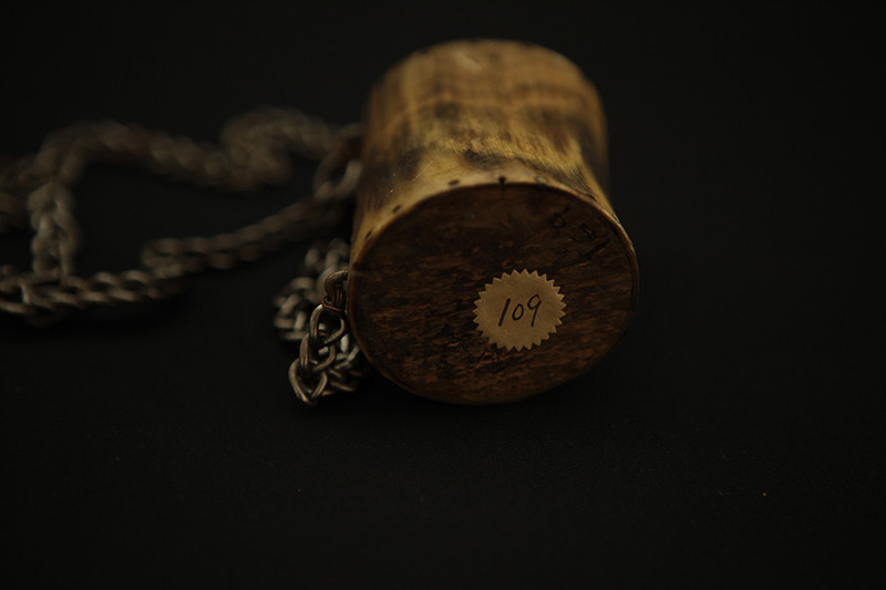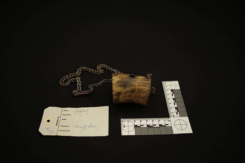 Transcription of entry in Accession Register (Ethnology Book 1) under no.109 [Source - Chiara Singh for FHYA, 2021: All text handwritten by F. W. Fitzsimons unless otherwise specified. Direct quotes are indicated in quote marks, with additions indicated in square brackets: "Snuff box made from ox-horn"; REMARKS: WRITTEN OFF: JUNE 1964 [Stamp, scribbled out with red pen]; LOCALITY: "do" [Meaning "ditto" = same as entry 106: "Natal"]; SOURCE AND DATE: "Purchased 1905". Other inscriptions: "19" [Meaning unknown]; "7/e/1" [Geographic area/community as per the category indicated on the Catalogue Card, which corresponds with "Natal / General"]; "C" [Meaning unknown"]; Red tick [Relates to an audit conducted on the collection between 1958 and 1961].]
