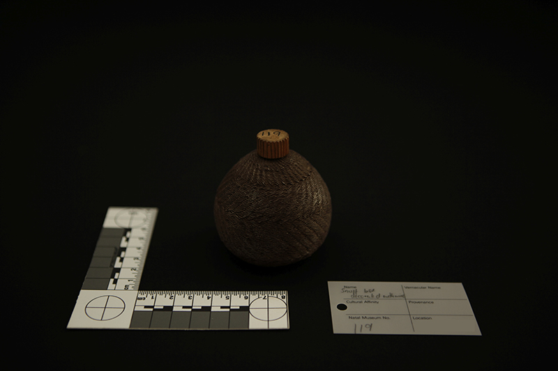 Transcription of entry in Accession Register (Ethnology Book 1) under no.119 [Source - Chiara Singh for FHYA, 2021: All text handwritten by F. W. Fitzsimons unless otherwise specified. Direct quotes are indicated in quote marks, with additions indicated in square brackets: "Ornamented gourd snuffbox"; LOCALITY: "do" [Meaning "ditto" same as entry 118: "Natal"]; SOURCE AND DATE: "J. Shires". Other inscriptions: "19" [Meaning unknown]; "C" [Meaning unknown"]; Red tick [Relates to an audit conducted on the collection between 1958 and 1961].]
