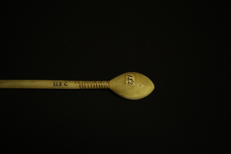 Transcription of entry in Accession Register (Ethnology Book 1) under no.123 [Source - Chiara Singh for FHYA, 2021: All text handwritten by F. W. Fitzsimons unless otherwise specified. Direct quotes are indicated in quote marks, with additions indicated in square brackets: "Two [crossed out in pencil] Three native spoons made from bone"; REMARKS: "1 more added"; LOCALITY: "do" [Meaning "ditto" same as entry 118: "Natal"]; SOURCE AND DATE: "Presented". Other inscriptions: "19" [Meaning unknown]; "7/e/1" [Geographic area/community as per the category indicated on the Catalogue Card, which corresponds with "Natal / General"]; Red tick [Relates to an audit conducted on the collection between 1958 and 1961].]