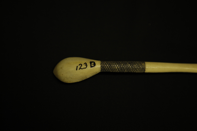 Transcription of entry in Accession Register (Ethnology Book 1) under no.123 [Source - Chiara Singh for FHYA, 2021: All text handwritten by F. W. Fitzsimons unless otherwise specified. Direct quotes are indicated in quote marks, with additions indicated in square brackets: "Two [crossed out in pencil] Three native spoons made from bone"; REMARKS: "1 more added"; LOCALITY: "do" [Meaning "ditto" same as entry 118: "Natal"]; SOURCE AND DATE: "Presented". Other inscriptions: "19" [Meaning unknown]; "7/e/1" [Geographic area/community as per the category indicated on the Catalogue Card, which corresponds with "Natal / General"]; Red tick [Relates to an audit conducted on the collection between 1958 and 1961].]