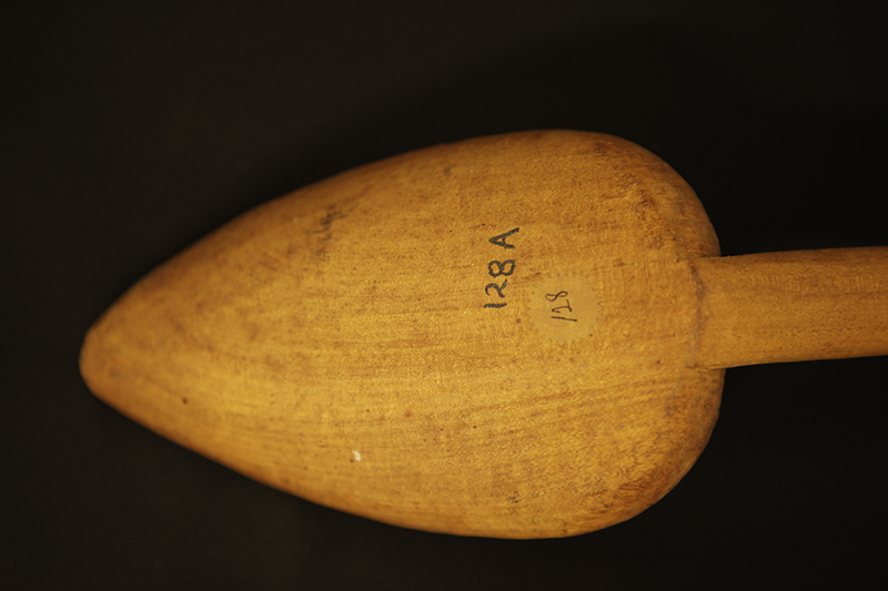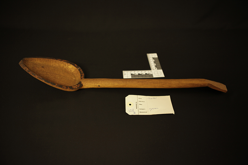 Transcription of entry in Accession Register (Ethnology Book 1) under no.128 [Source - Chiara Singh for FHYA, 2021: All text handwritten by F. W. Fitzsimons unless otherwise specified. Direct quotes are indicated in quote marks, with additions indicated in square brackets: "Five native wood spoons"; LOCALITY: "do" [Meaning "ditto" same as entry 125: "Natal"]; SOURCE AND DATE: "do" [Meaning "ditto" same as entry 127: "Presented"]. Other inscriptions: "19" [Meaning unknown]; "7/e/1" [Geographic area/community as per the category indicated on the Catalogue Card, which corresponds with "Natal / General"]; Red tick [Relates to an audit conducted on the collection between 1958 and 1961].]