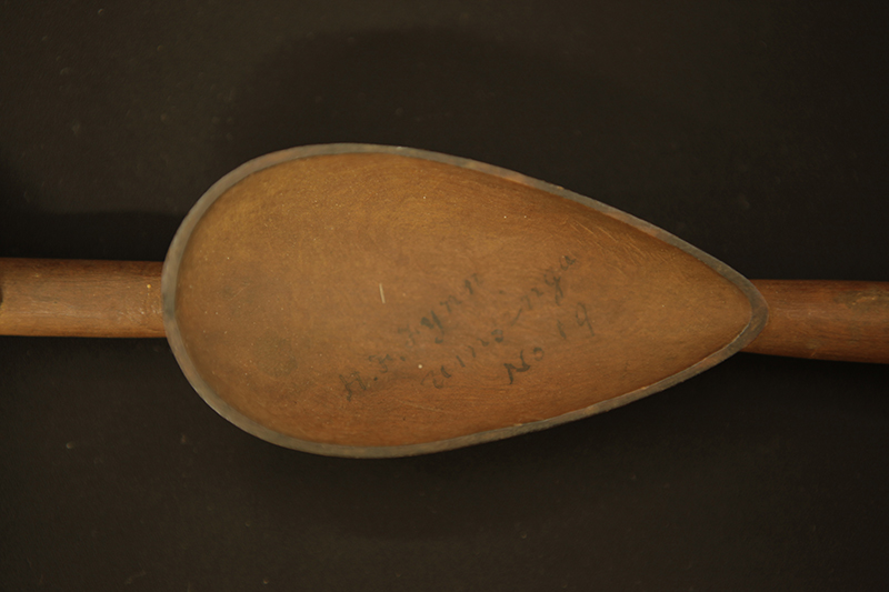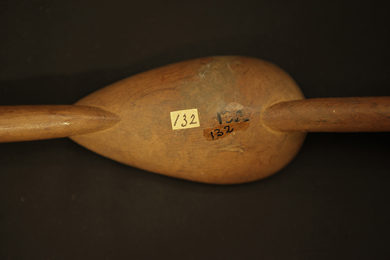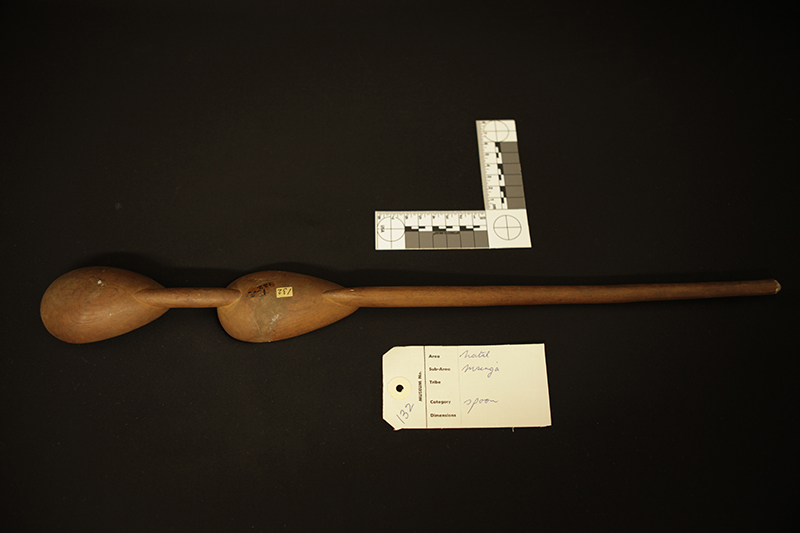 Transcription of entry in Accession Register (Ethnology Book 1) under no.132 [Source - Chiara Singh for FHYA, 2021: All text handwritten by F. W. Fitzsimons unless otherwise specified. Direct quotes are indicated in quote marks, with additions indicated in square brackets: "Native wood spoon (double)"; LOCALITY: "Umsinga N." [Natal]; SOURCE AND DATE: "H.F. Fynn". Other inscriptions: "19" [Meaning unknown]; "7/j/3" [Geographic area/community as per the category indicated on the Catalogue Card, which corresponds with "Zululand Zulu"]; "C" [Meaning unknown]; Red tick [Relates to an audit conducted on the collection between 1958 and 1961].]