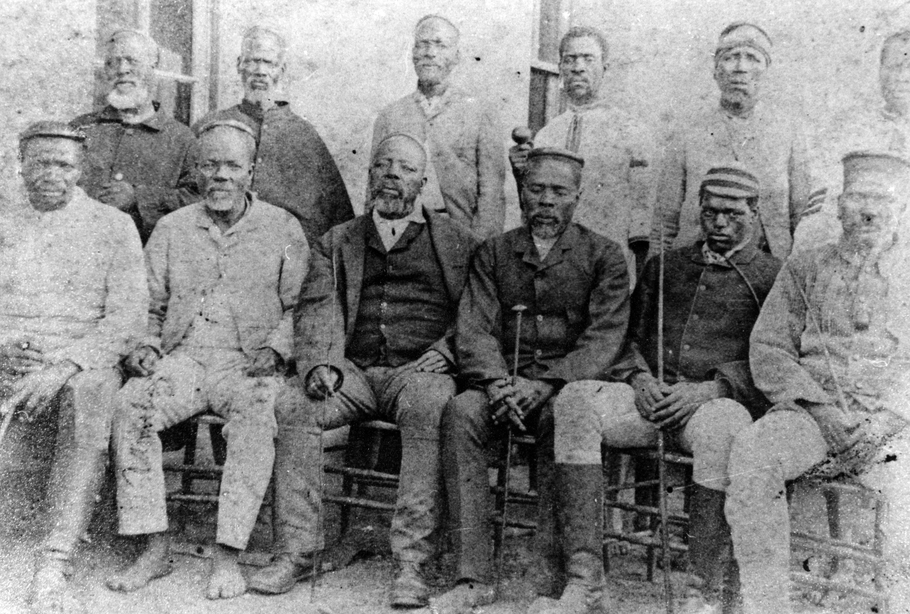 [Source of metadata - Makhosi Mkhize for FHYA, 2024, using a caption from Heather Hughes' PhD thesis 'Politics and Society in Inanada, Natal: The Qadi Under Chief Mqhawe, c1840-1906': Chiefs of the Inanda Location, 1890s. L to R, front row: Sotobe, Mbozane, Mqhawe, Ncapai, Deliweyo and Swaimana, from Album C57 at the Killie Campbell Africana Library.]