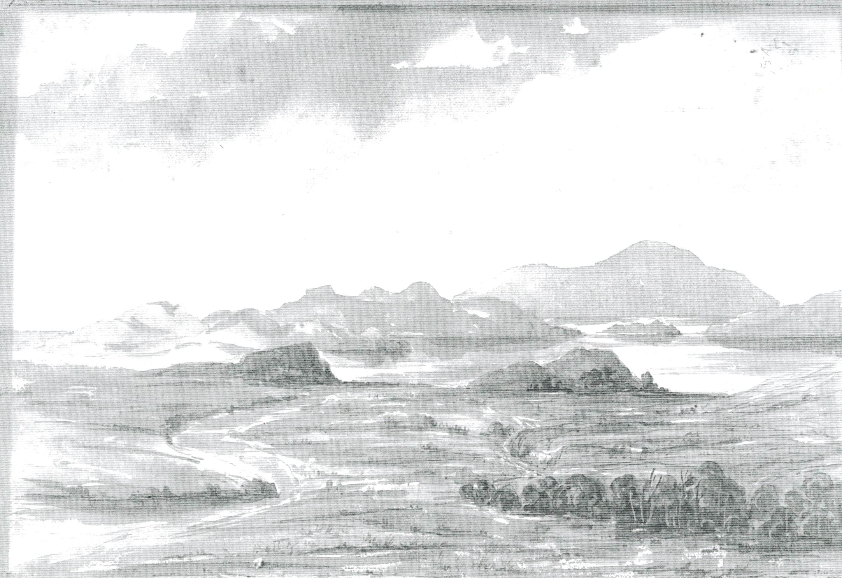 [Source - Chloe Rushovich for FHYA, 2022, using material provided by Hlonipha Mokoena: A black and white copy of a landscape watercolour painting of Ekukhanyeni made by Magema Fuze.]