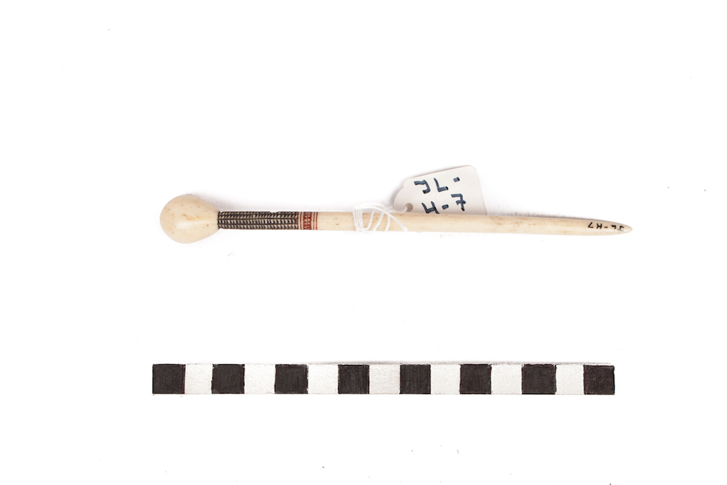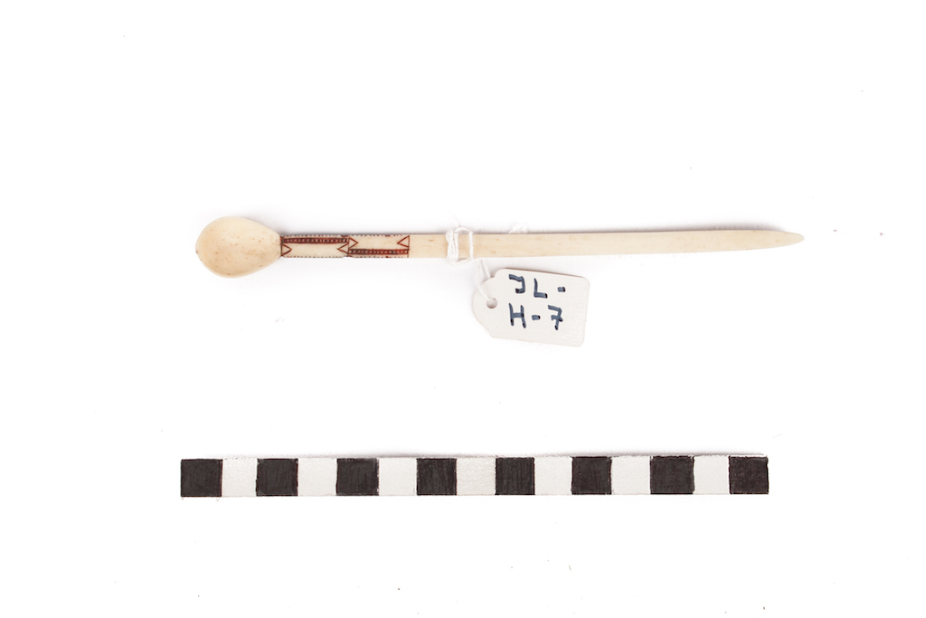 Additional information [Source - Sarah Schaefer for FHYA, 2020, transcription of the Brenthurst catalogue, 'Art and Ambiguity: Perspectives on the Brenthurst Collection of Southern African Art', produced by the Johannesburg Art Gallery, 1991: Snuff-spoon; bone, pigment; 15,5 x 1,6 x 0,5; North Nguni/South Nguni; JL-H-7]