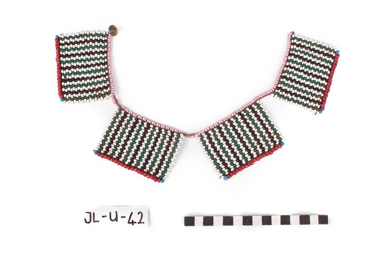 Additional information [Source - Sarah Schaefer for FHYA, 2020, transcription of the Brenthurst catalogue, 'Art and Ambiguity: Perspectives on the Brenthurst Collection of Southern African Art', produced by the Johannesburg Art Gallery, 1991: Beadwork; sinew, glass (seed-beads), brass (button); extended: 36,8 x 6,2 x 0,6; North Nguni, Natal chiefdoms?; JL-U-42]