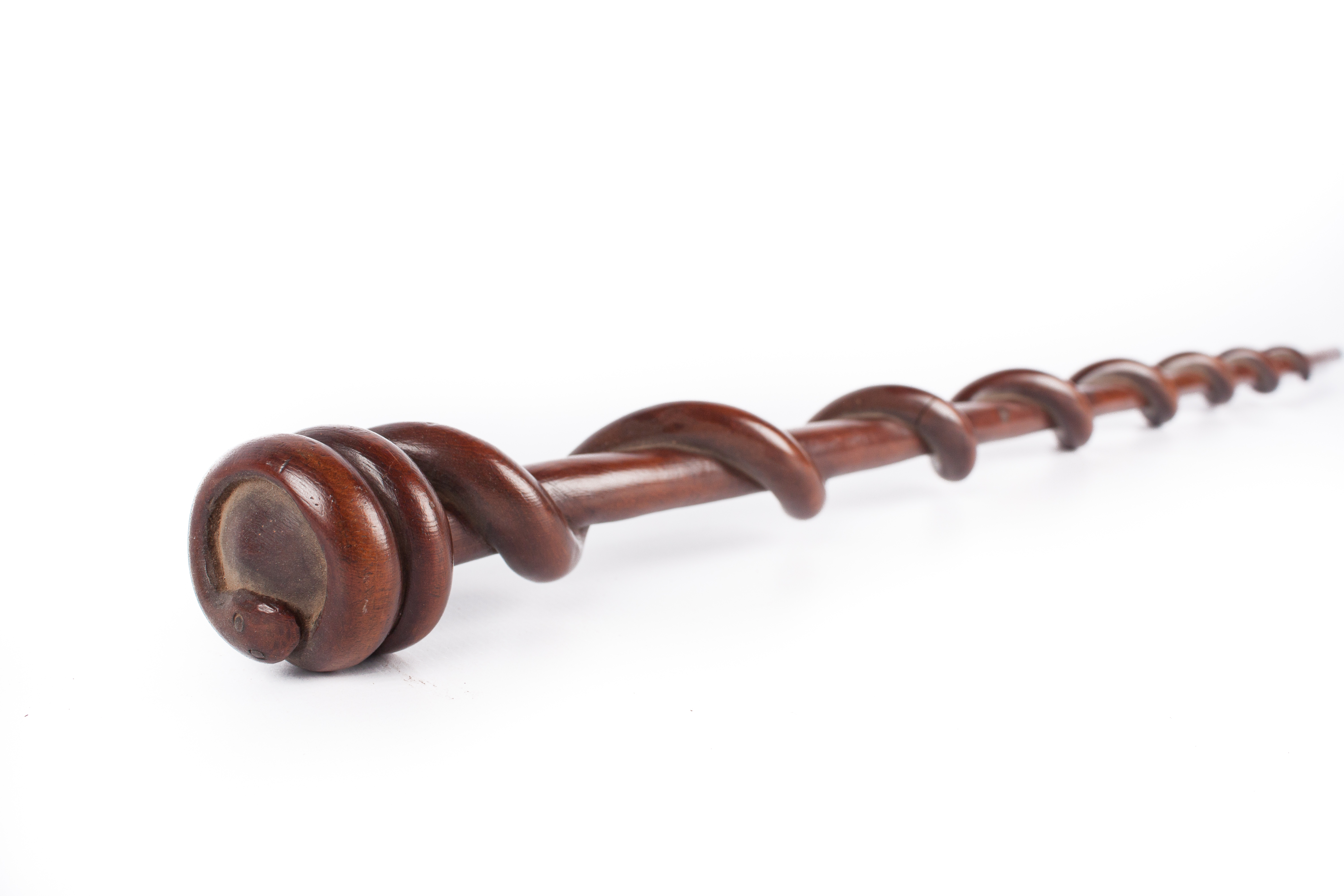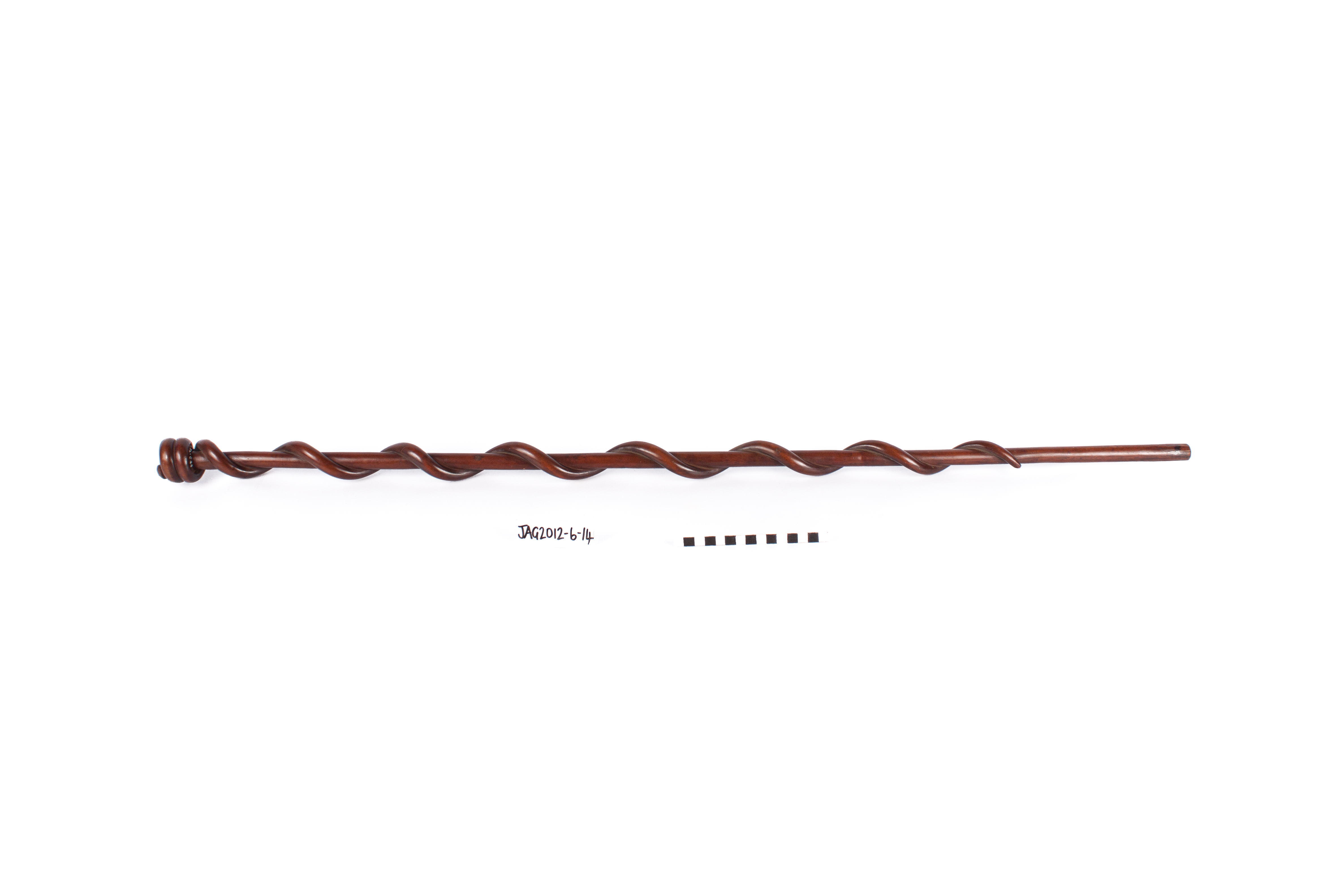 Description [Source - Phillipa van Straaten, curator of the Traditional Collections at JAG, for FHYA using JAG materials, 2017: Staff, Southern Nguni, 19th century; Description: Lighter amber- coloured wood, with round knob and carved snake wrapped and twisted around shaft; Dimensions: Length 109,2cm Material: Wood]