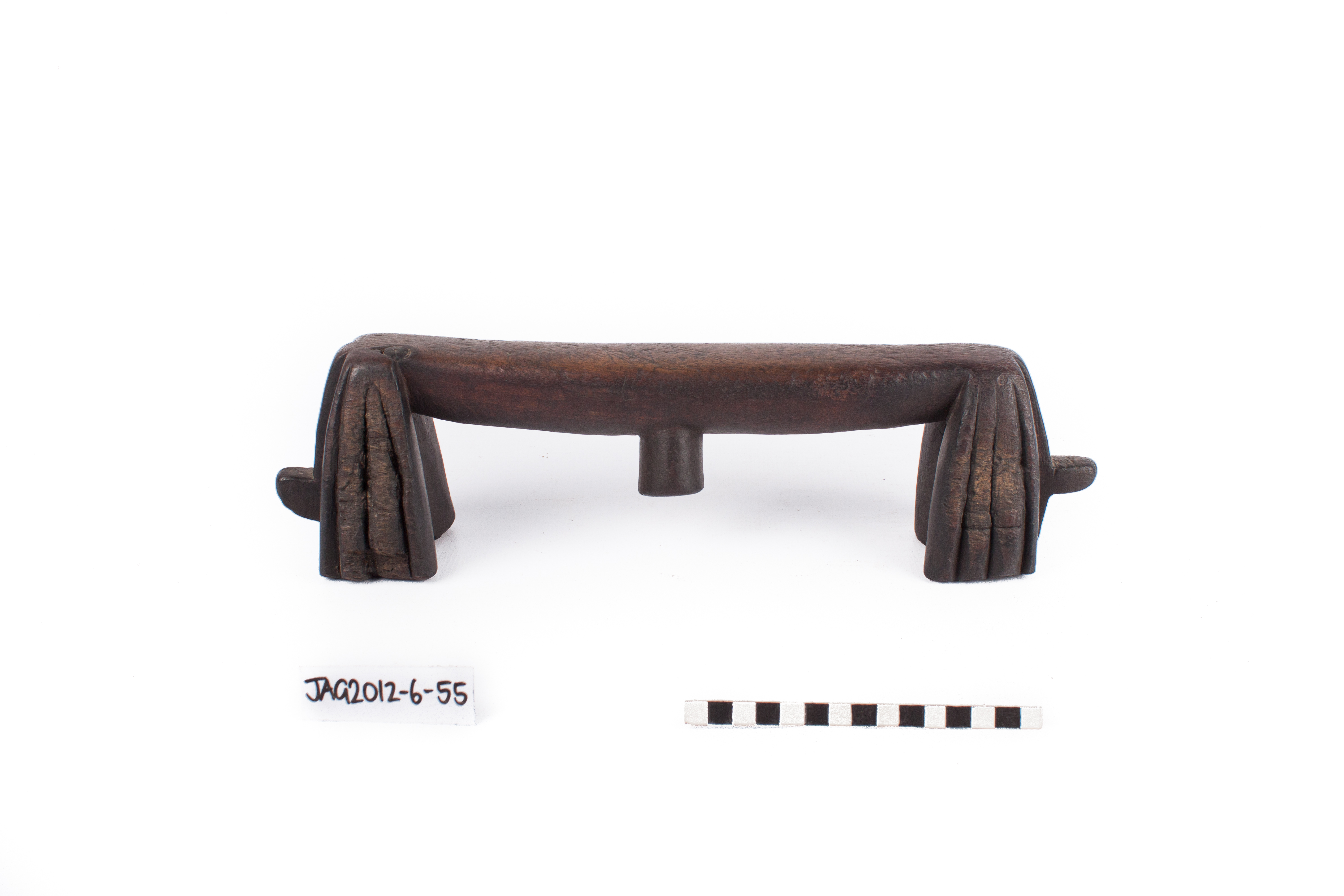 Description [Source - Phillipa van Straaten, curator of the Traditional Collections at JAG, for FHYA using JAG materials, 2017: Headrest, Northern Nguni, 19th/20th century; Description: Carved wooden headrest, with two legs and tails, carved in animal shape/form; Centre lug; Dimensions: 12,4cm x 43,5cm x 10cm Material: Wood, carving.]