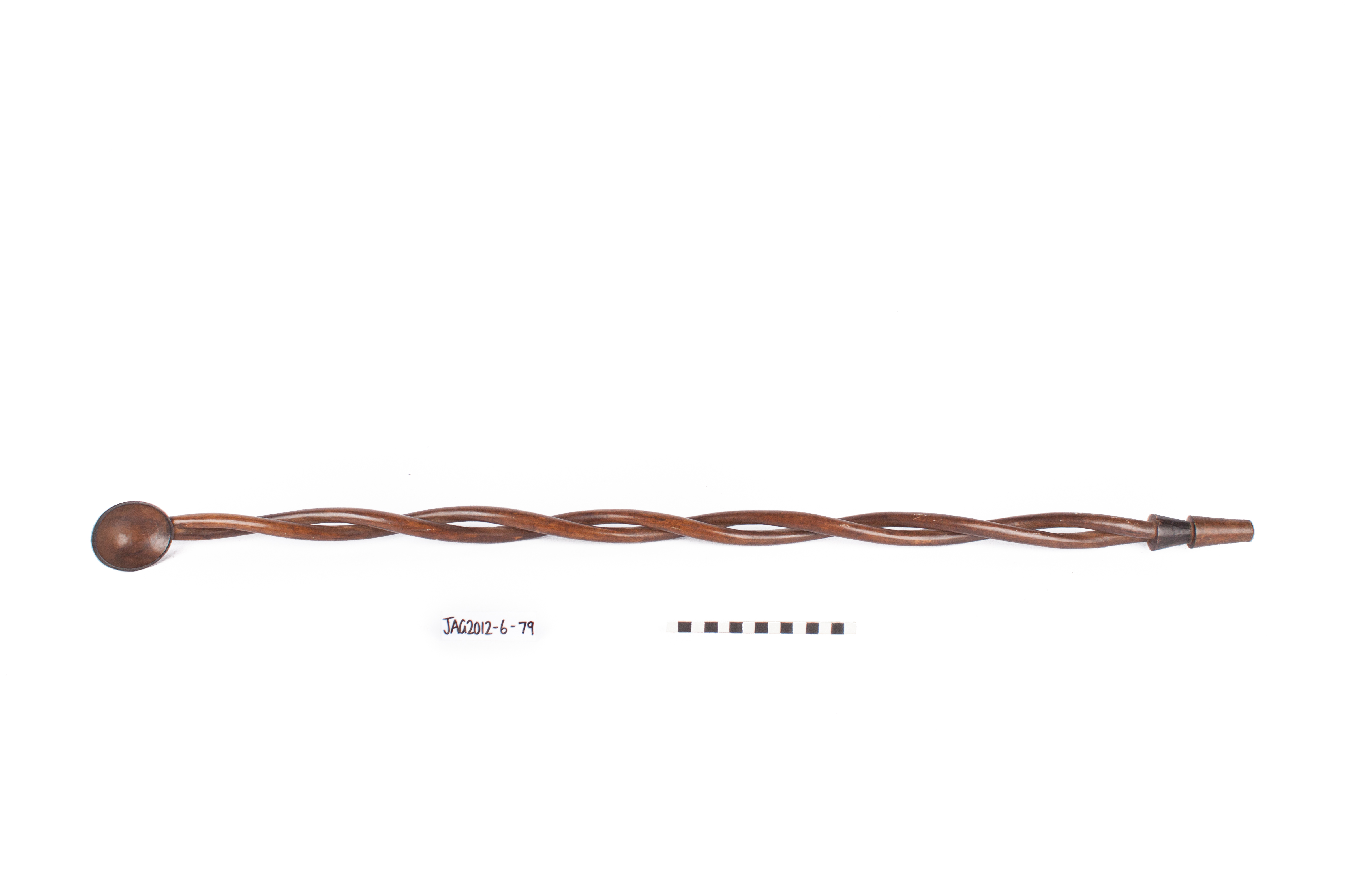 Description [Source - Phillipa van Straaten, curator of the Traditional Collections at JAG, for FHYA using JAG materials, 2017: Spoon staff, Northern Nguni, 19th century; Description: Twisted carved wooden spoon staff, with carved 'LTD' at the back of the spoon cup; Dimensions: Length 99cm; Material: Wood, carved letters, pokerwork]