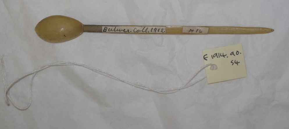 Attributions and conjectures [Source - MAA, 2017: Names: Spoon Classified: Keyword: Tools; Narcotics and Intoxicants Material: Bone, Hair Descriptions: Spoon – One of seven bone snuff spoons of distinct pattern. 5 ordinary bowls, one elongated and one kidney shaped. All incised and the incisions blacked in. One with animal hair (elephant?) wrapped round it. 'With animal hair.' Local: Maker: Cultural Group: Author: Date Made: Dimensions: 13,1 cm long, 1.5 cm wide, 0.4 cm high Source: Bulwer, Henry (collector and donor) Source Date: Place: Africa; Southern Africa; South Africa; Natal Period: Contexts: General Card for 1914.90.1 - 154: NB The Bulwer Collection of 1912 was found to be slightly confused when it was sorted out. The objects found marked "Bulwer Collection 1912" did not always tally with the description in the Annual Report. Some objects did not appear on the list at all - these have been added to the Z Register (created by the Museum's second curator, Louis Clarke, instigated in January 1923) and as far as possible their numbers appear overleaf. All cards marked Bulwer Collection were taken out and were given the new appropriate numbers, but it was found that often there were many more of a certain kind of object than mentioned in the list. Where this has happened I have altered the original description in the accession book and on the cards in order to try to fit these in, rather than picking certain objects at random to be added to the Z Register, since apparently objects given by Bulwer filtered in at various times over the years, especially after his death, but were not recorded. Since all the objects were Zulu, I think its best to keep them together. (Note found in accession register, written by Kay Holman) - MAA (01/12/1998)]