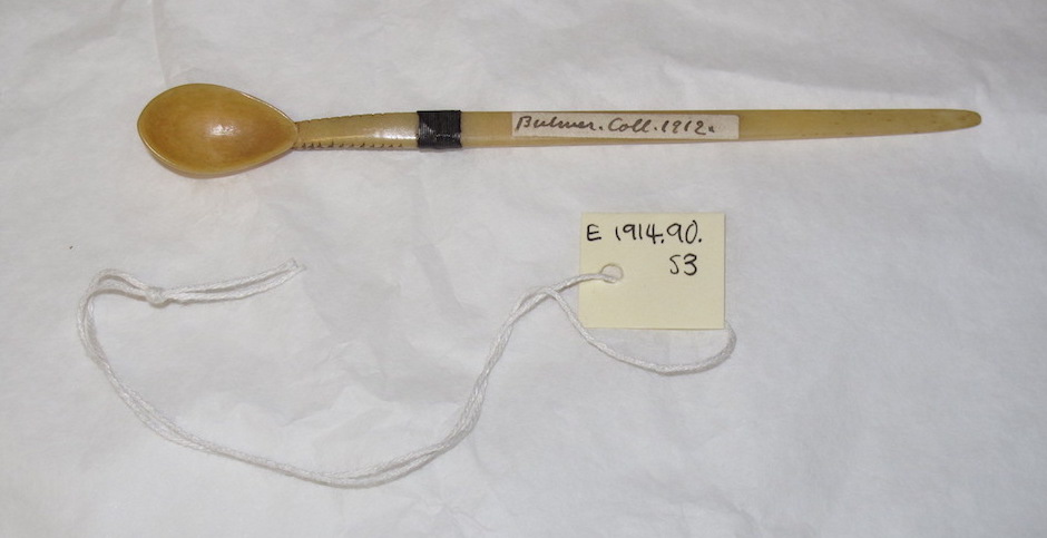 Attributions and conjectures [Source - MAA, 2017: Names: Spoon Classified: Keyword: Tools; Narcotics and Intoxicants Material: Bone Descriptions: Spoon – One of seven bone snuff spoons of distinct pattern. 5 ordinary bowls, one elongated and one kidney shaped. All incised and the incisions blacked in. One with animal hair (elephant?) wrapped round it. 'With animal hair' - Rachel Hand 4/1/2002 Local: Maker: Cultural Group: Author: Date Made: Dimensions: 13,2 cm long, 1.4 cm wide, 0.6 cm high Source: Bulwer, Henry (collector and donor) Place: Africa; Southern Africa; South Africa; Natal Period: Contexts: General Card for 1914.90.1 - 154: NB The Bulwer Collection of 1912 was found to be slightly confused when it was sorted out. The objects found marked "Bulwer Collection 1912" did not always tally with the description in the Annual Report. Some objects did not appear on the list at all - these have been added to the Z Register (created by the Museum's second curator, Louis Clarke, instigated in January 1923) and as far as possible their numbers appear overleaf. All cards marked Bulwer Collection were taken out and were given the new appropriate numbers, but it was found that often there were many more of a certain kind of object than mentioned in the list. Where this has happened I have altered the original description in the accession book and on the cards in order to try to fit these in, rather than picking certain objects at random to be added to the Z Register, since apparently objects given by Bulwer filtered in at various times over the years, especially after his death, but were not recorded. Since all the objects were Zulu, I think its best to keep them together. (Note found in accession register, written by Kay Holman) - MAA (01/12/1998)]