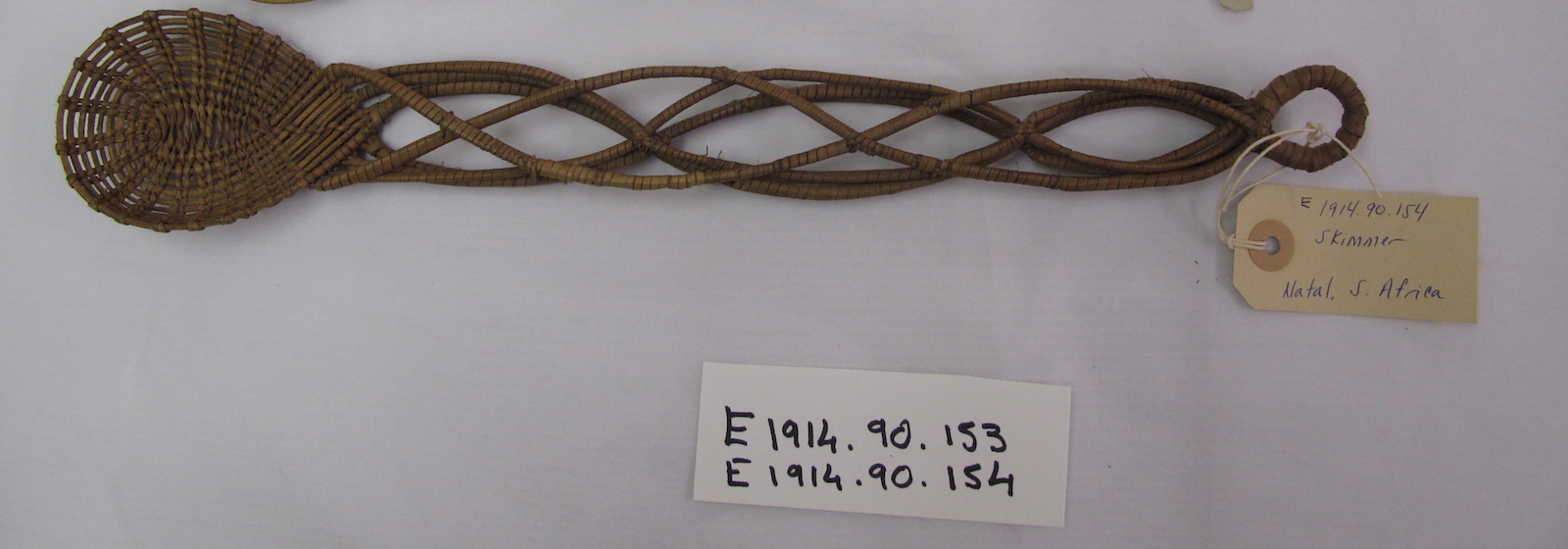 Attributions and conjectures [Source - MAA, 2017: Names: Skimmer Classified: Keyword: Tools, Food Preparation Material: Plant; Cane; Basketry Descriptions: Skimmer; Tool - Spoon shaped skimmer of bound and wrapped cane (or similar) decoratively interwoven. Local: Maker: Cultural Group: Zulu Author: Date Made: Dimensions: Source: Bulwer Collection Source Date: 1912 Place: Africa; Southern Africa; South Africa - MAA (01/12/1998) Period: Contexts: Collected by the donor 1874 - 1882. General Card for 1914.90.1 - 154: NB The Bulwer Collection of 1912 was found to be slightly confused when it was sorted out. The objects found marked "Bulwer Collection 1912" did not always tally with the description in the Annual Report. Some objects did not appear on the list at all - these have been added to the Z Register (created by the Museum's second curator, Louis Clarke, instigated in January 1923) and as far as possible their numbers appear overleaf. All cards marked Bulwer Collection were taken out and were given the new appropriate numbers, but it was found that often there were many more of a certain kind of object than mentioned in the list. Where this has happened I have altered the original description in the accession book and on the cards in order to try to fit these in, rather than picking certain objects at random to be added to the Z Register, since apparently objects given by Bulwer filtered in at various times over the years, especially after his death, but were not recorded. Since all the objects were Zulu, I think its best to keep them together. (Note found in accession register, written by Kay Holman) - MAA (01/12/1998) Updated: 22/07/2008 Created: 01/12/1998]