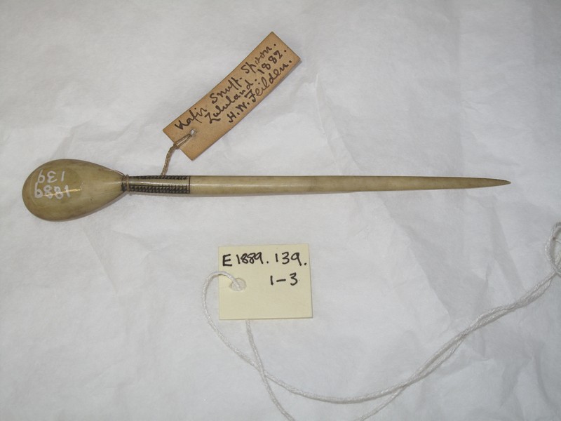 Attributions and conjectures [Source - Nessa Leibhammer for FHYA, 2012, using MAA materials: Names: Comb - MAA (01/12/1998) Classified: Keyword: Personal Adornment; Toilet and Hygiene Material: Bone Descriptions: Comb, bone - MAA (01/12/1998) Local: Maker: Cultural Group: Author: Date Made: Dimensions: 22.4 cm long, 2 cm wide, 0.3 cm high Source: Feilden, H.W. (donor) Source Date: 1882 Place: Africa; Southern Africa; South Africa; Natal - MAA (01/12/1998) Period: Contexts: (bio) Colonel Henry W. Feilden MAA (01/12/1998) Updated: 26/07/2013 Created: 01/12/1998]