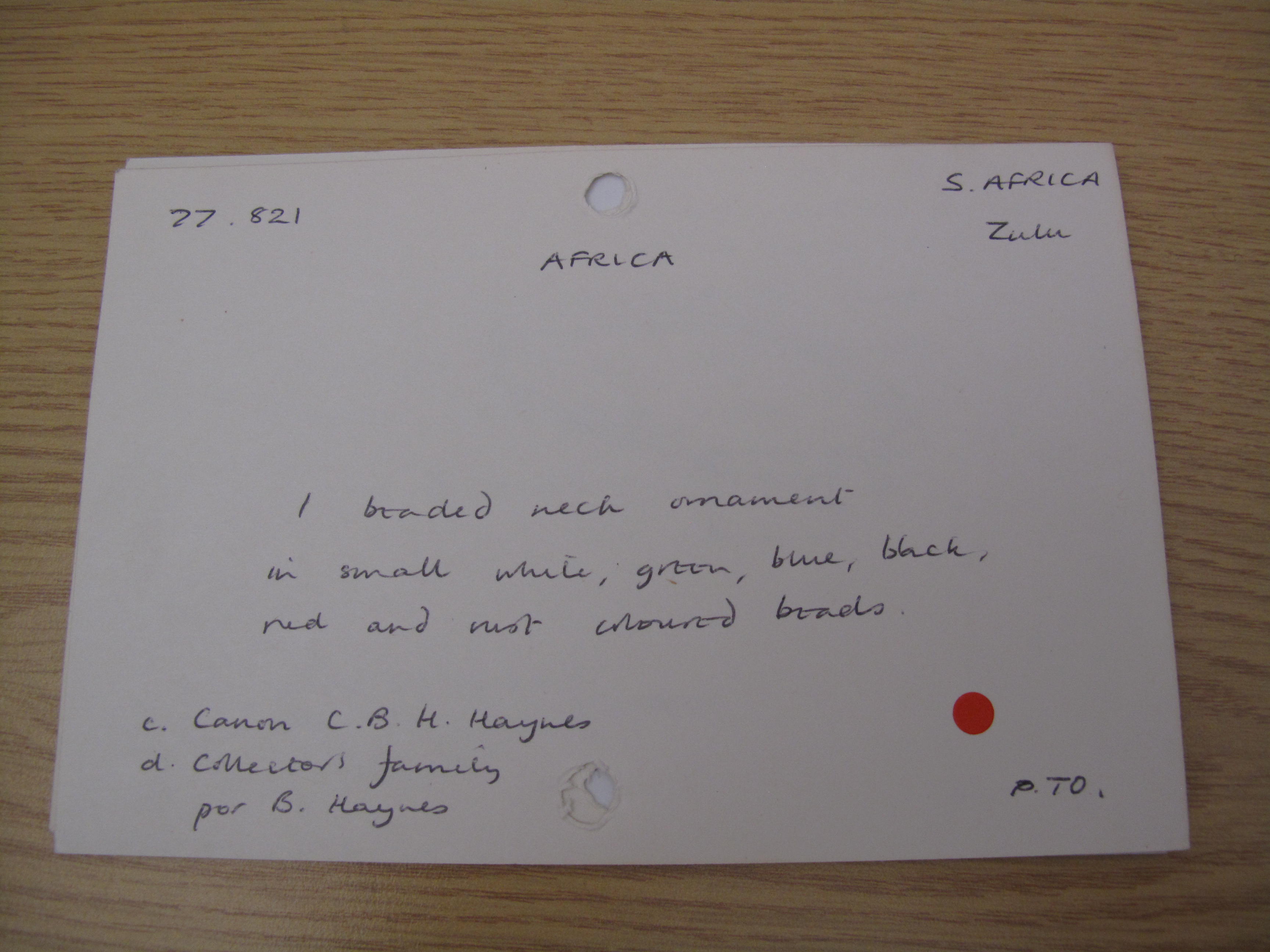 [Source - Rachel Hand for MAA, 2016: The Museum's catalogue cards and labels are part of the institution's and the objects' very history. Catalogue cards were created to add additional object information from the very first accessions back in 1884 and replacement cards were made if the original was lost, usually using both different pens and terms. Original sale or collector labels could be stuck to the cards to add biographical layers of information in the same way that letters and later photographs were sometimes attached to cards. Staff and sometimes visitors would add comments on provenances, measurements and locations over time. Reconnecting an author with their annotations can add to our knowledge of the object's history and associations. The era and author of the cards also is reflected in their physical aspects: initially details were handwritten in ink, the 1930s saw cards stamped and written on a typewriter, followed variously by handwritten details in ballpoint pen, finally moving to word-processed and laser printed texts. Like the cards the physical type of paper and pen used can suggest dates as well as authors. They can be used to confirm the identity of misplaced objects, e.g. Henry Bulwer's collection bears distinctive long, rectangular shaped paper labels and his cursive script. Early labels were handwritten in ink, on small rectangular paper or parchment label and tied through small metal reinforced holes. Others were glued directly to the object. Smaller rectangular or square paper labels, with a printed outline, usually stuck directly to the object, usually originate in late nineteenth or early twentieth century salerooms or via a collector. Larger circular, metal-edged labels were written in the museum, probably from the 1970s onwards. The 1980s bought larger labels on thick yellow paper, and remained handwritten. From c.2000, we have used acid-free yellowish paper labels, that are written on in light-sensitive and waterproof ink.]