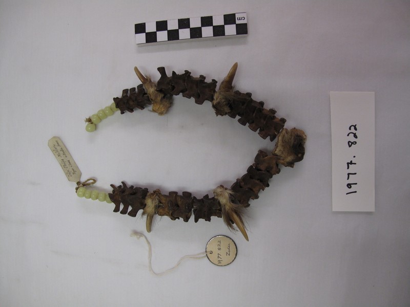 Attributions and conjectures [Source - Nessa Leibhammer for FHYA, 2012, using MAA materials: Names: Necklace - MAA (01/12/1998) Classified: Keyword: Personal Adornment; Ceremonial Objects Material: Claw; Bone; Glass; Bead Descriptions: A chief's necklace of tiger claws, snake bones and whitish glass beads. Carries old label with 10/- price on it - MAA (01/12/1998) Local: Maker: Cultural Group: Zulu Author: Date Made: Dimensions: Source: Haynes, C. B. H. (collector); Haynes, B. (donor) Source Date: Place: Africa; Southern Africa; South Africa - MAA (01/12/1998) Period: Contexts: Source donated by collector's family per B. Haynes - MAA (01/12/1998) Updated: 08/05/2014 Created: 01/12/1998]