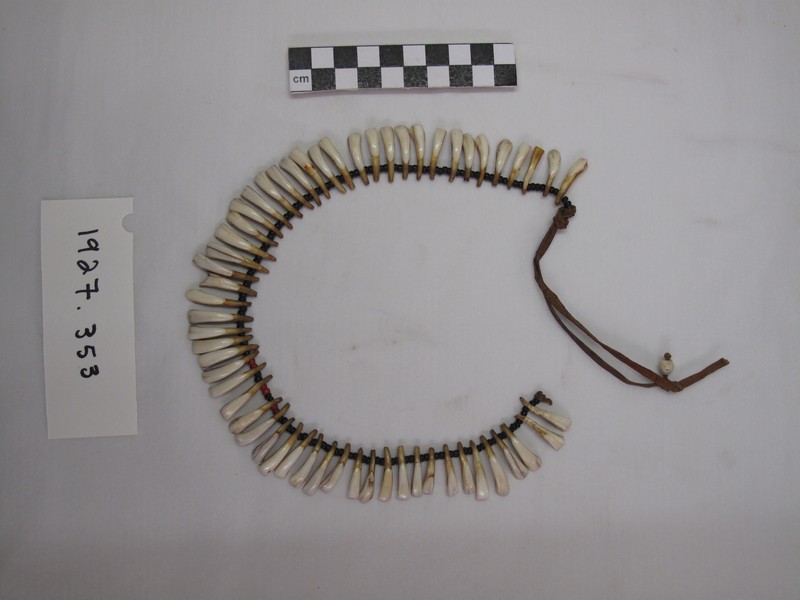 Attributions and conjectures [Source - Nessa Leibhammer for FHYA, 2012, using MAA materials: Names: Necklace - MAA (01/11/1998) Classified: Keyword: Personal Adornment Material: Tooth; Bead; Glass; Fibre; Hide Descriptions: ?Zulu necklace of teeth and black beads - MAA (01/11/1998) Local: Maker: Cultural Group: ?Zulu Author: Date Made: Dimensions: Source: Ridgeway Source Date: Place: Africa; Southern Africa; South Africa; ?Transkei - MAA (01/11/1998) Period: Contexts: This has had Zulu crossed out and Transkei written on the label - MAA (01/11/1998) Updated: 08/05/2014 Created: 01/11/1998]
