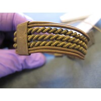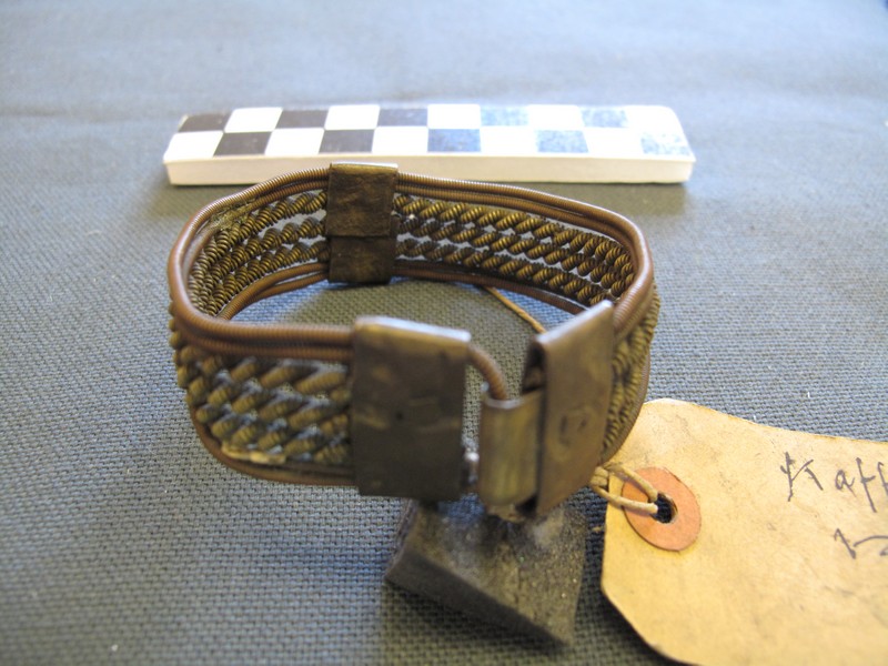 Attributions and conjectures [Source - MAA, 2012 Name: Bracelet - MAA (01/11/1998) Classified: Keyword: Personal Adornment Material: Metal; Brass; Copper Descriptions: Brass and copper wire bracelet. Outer rings of plain coiled copper, inner 3 rings of thick coiled and (double stranded) wrapped round brass. 3 brass bands hold it together and there is a hook and eye... - MAA (01/11/1998) Local: Maker: Cultural Group: Author: Date Made: Dimensions: Source: Ridgeway Source Date: Place: Africa; Southern Africa; South Africa - MAA (01/11/1998) Period: Contexts: MAA (00/00/0000) Updated: 16/07/2008 Created: 01/11/1998]