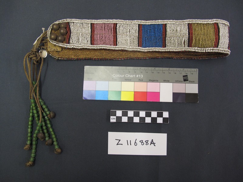 Attributions and conjectures [Source - Nessa Leibhammer for FHYA, 2012, using MAA materials: Names: Belt - MAA (01/12/1998) Classified: Keyword: Personal Adornment; Clothing Material: Bead; Grass; Metal; Brass Descriptions: Women's beadwork belts. Vertical stripes on twisted grass foundation, except C which is chequered. A, B: With ?brass metal studs. A; with large green beads - Rachel Hand 10/12/2001 - MAA (01/12/1998) Local: Maker: Cultural Group: Zulu Author: Date Made: Dimensions: Source: Source Date: Place: Africa; Southern Africa; South Africa - MAA (01/12/1998) Period: Contexts: MAA (00/00/0000) Updated: 16/07/2008 Created: 01/12/1998]