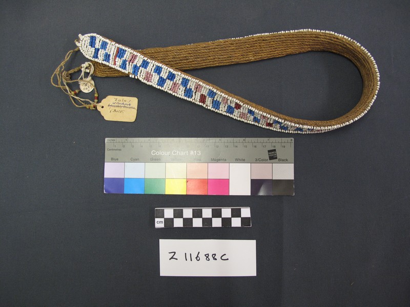 Attributions and conjectures [Source - Nessa Leibhammer for FHYA, 2012, using MAA materials: Names: Belt - MAA (01/12/1998) Classified: Keyword: Personal Adornment; Clothing Material: Bead; Grass; Metal; Brass Descriptions: Women's beadwork belts. Vertical stripes on twisted grass foundation, except C which is chequered. A, B: With ?brass metal studs. A; with large green beads - Rachel Hand 10/12/2001 - MAA (01/12/1998) Local: Maker: Cultural Group: Zulu Author: Date Made: Dimensions: Source: Source Date: Place: Africa; Southern Africa; South Africa - MAA (01/12/1998) Period: Contexts: MAA (00/00/0000) Updated: 16/07/2008 Created: 01/12/1998]