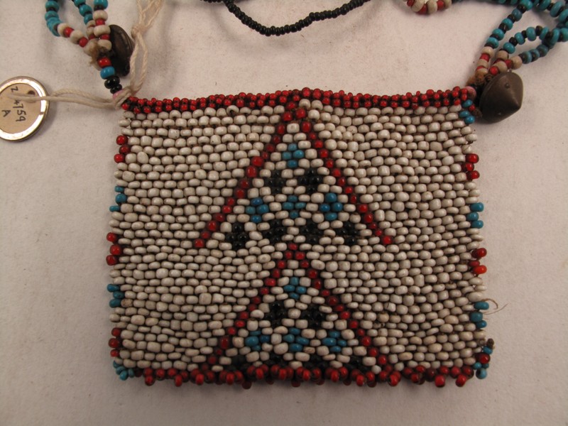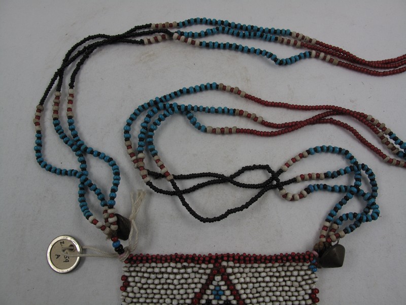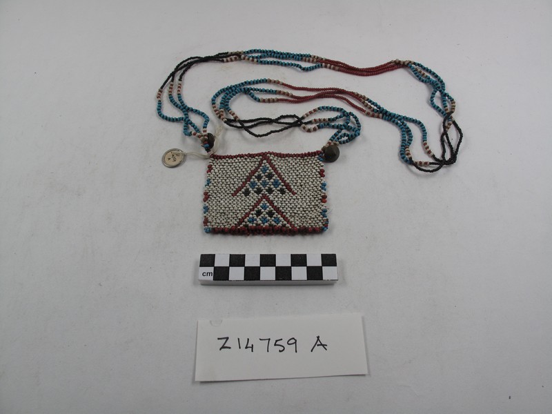 Attributions and conjectures [Source - Nessa Leibhammer for FHYA, 2012, using MAA materials: Names: Necklace - MAA (15/01/1999) Pendant - MAA (15/01/1999) Classified: Keyword: Personal Adornment Material: Bead; Glass; Fibre; Metal; Brass Descriptions: Necklaces with rectangular pendant, bead. A: Triple long string of beads. Pendant has white ground with red, blue and black ornaments. B: Short single string. Pendant blue on pink. Added note on back of catalogue card: A: Strands (from pendant out) white/red, black/blue, white/red, small black, white/red, blue/black, white/red, small red, red/white, blue/black, white/red, black. Two brass cone buttons. Pendant. Red on top border and bottom border (clustered), sides triangles of red, blue. On pendant two red Vs pointing upwards, in them alternate blue and black clusters of 4 beads in rows. B: Strand of blue and white sections alternating. Pendant has lower border black and white tassels. The body pink, with a blue inverted V with top missing, and a row of blue along the bottom - MAA (15/01/1999) Local: Maker: Cultural Group: Xhosa Author: Date Made: Dimensions: Source: Unknown Source Date: Place: Africa; Southern Africa; South Africa; Transkei - MAA (15/01/1999) Period: Contexts: MAA (00/00/0000) Updated: 04/08/2014 Created: 15/01/1999]