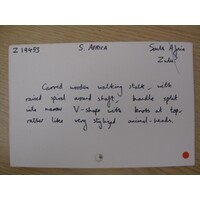 [Source - Chloe Rushovich for FHYA, 2018: File contains object identified by Nessa Leibhammer for FHYA using MAA materials as "stick", a label, and a catalogue card.]