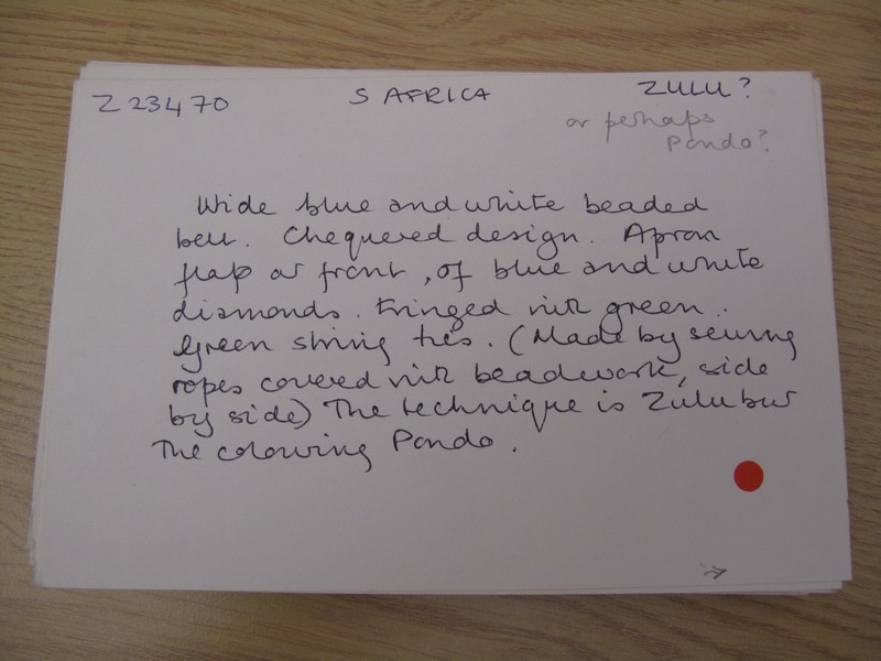 [Source - Rachel Hand for MAA, 2016: The Museum's catalogue cards and labels are part of the institution's and the objects' very history. Catalogue cards were created to add additional object information from the very first accessions back in 1884 and replacement cards were made if the original was lost, usually using both different pens and terms. Original sale or collector labels could be stuck to the cards to add biographical layers of information in the same way that letters and later photographs were sometimes attached to cards. Staff and sometimes visitors would add comments on provenances, measurements and locations over time. Reconnecting an author with their annotations can add to our knowledge of the object's history and associations. The era and author of the cards also is reflected in their physical aspects: initially details were handwritten in ink, the 1930s saw cards stamped and written on a typewriter, followed variously by handwritten details in ballpoint pen, finally moving to word-processed and laser printed texts. Like the cards the physical type of paper and pen used can suggest dates as well as authors. They can be used to confirm the identity of misplaced objects, e.g. Henry Bulwer's collection bears distinctive long, rectangular shaped paper labels and his cursive script. Early labels were handwritten in ink, on small rectangular paper or parchment label and tied through small metal reinforced holes. Others were glued directly to the object. Smaller rectangular or square paper labels, with a printed outline, usually stuck directly to the object, usually originate in late nineteenth or early twentieth century salerooms or via a collector. Larger circular, metal-edged labels were written in the museum, probably from the 1970s onwards. The 1980s bought larger labels on thick yellow paper, and remained handwritten. From c.2000, we have used acid-free yellowish paper labels, that are written on in light-sensitive and waterproof ink.]