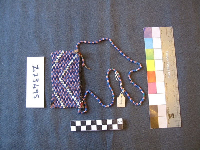 Attributions and conjectures [Source - Nessa Leibhammer for FHYA, 2012, using MAA materials: Names: Necklace - MAA (01/11/1998) Classified: Keyword: Personal Adornment Material: Bead; Glass; Fibre Descriptions: Beaded 'letter' necklace. Necklace dark blue, bright blue and pink beads. 'Letter' rectangle of beadwork. Checkered blue and pink, with two white chevrons. Black beads along upper edge - MAA (01/11/1998) Local: Maker: Cultural Group: Author: Date Made: Dimensions: Source: Unknown Source Date: Place: Africa; Southern Africa; ?Swaziland - MAA (01/11/1998) Africa; Southern Africa; South Africa; ?Southern Natal - Rachel Hand (10/04/2013) Period: Contexts: MAA (00/00/0000) The colours appear similar to these from Bellair in the collection and would suggest a southern Natal provenance rather than Swaziland. From notes by Nessa Leibhammer, Johannesburg Museum and Art Gall... - Rachel Hand (10/04/2013) Updated: 22/07/2008 Created: 01/11/1998]