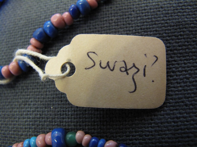 Attributions and conjectures [Source - Nessa Leibhammer for FHYA, 2012, using MAA materials: Names: Necklace - MAA (01/11/1998) Classified: Keyword: Personal Adornment Material: Bead; Glass; Fibre Descriptions: Beaded 'letter' necklace. Necklace dark blue, bright blue and pink beads. 'Letter' rectangle of beadwork. Checkered blue and pink, with two white chevrons. Black beads along upper edge - MAA (01/11/1998) Local: Maker: Cultural Group: Author: Date Made: Dimensions: Source: Unknown Source Date: Place: Africa; Southern Africa; ?Swaziland - MAA (01/11/1998) Africa; Southern Africa; South Africa; ?Southern Natal - Rachel Hand (10/04/2013) Period: Contexts: MAA (00/00/0000) The colours appear similar to these from Bellair in the collection and would suggest a southern Natal provenance rather than Swaziland. From notes by Nessa Leibhammer, Johannesburg Museum and Art Gall... - Rachel Hand (10/04/2013) Updated: 22/07/2008 Created: 01/11/1998]