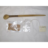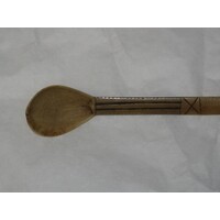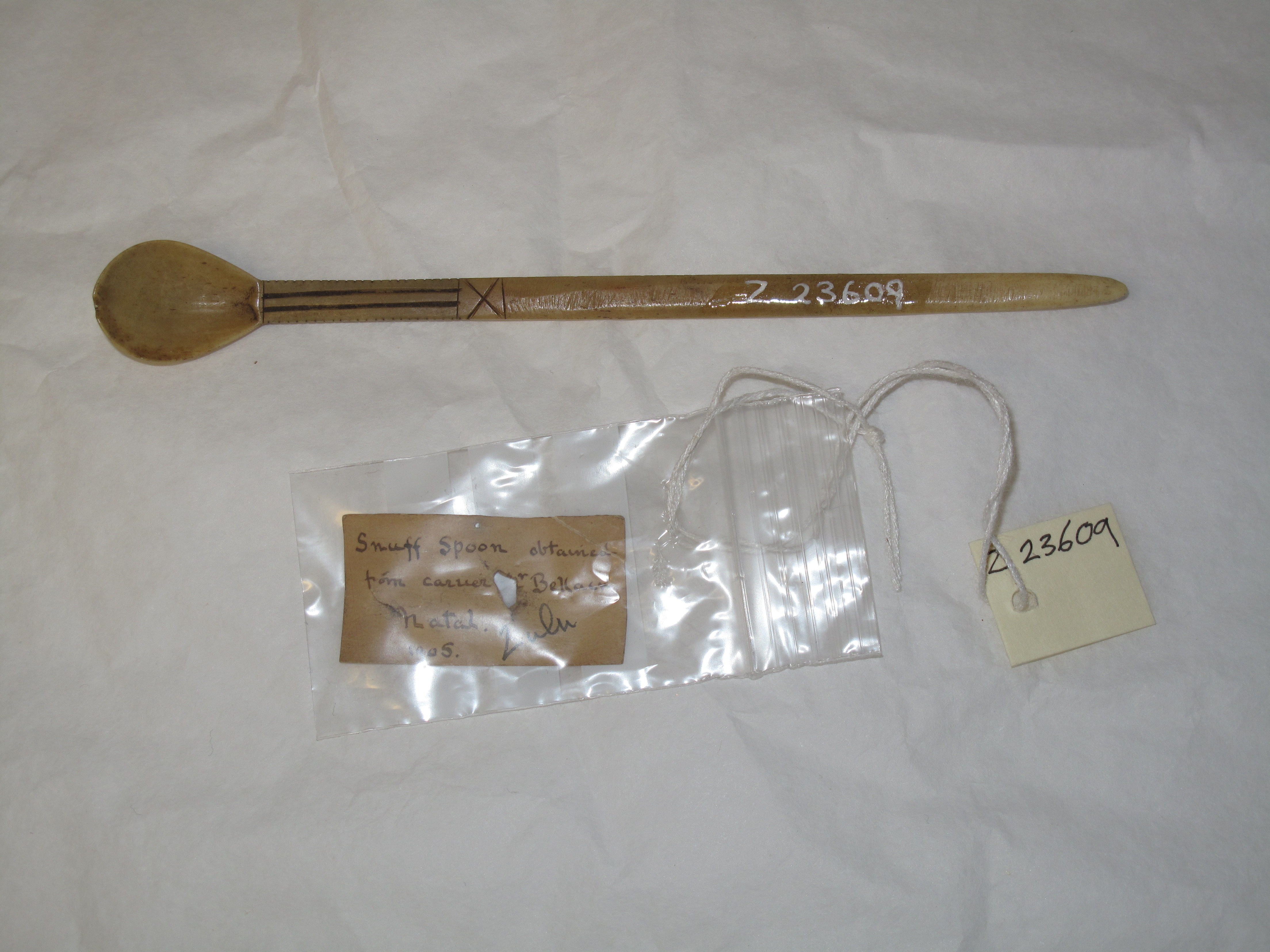 Attributions and conjectures [Source - Nessa Leibhammer for FHYA, 2012, using MAA materials: Names: Spoon - MAA (10/12/2001) Classified: Keyword: Narcotics and Intoxicants; Tools Material: Bone; ?Pigment Descriptions: Bone snuff spoon with black incised lines - MAA (10/12/2001) Local: Maker: Cultural Group: ?Zulu Author: Date Made: Dimensions: 15.2 cm long, 1.8 cm wide, 0.4 cm high Source: Source Date: Place: Africa; Southern Africa; South Africa; Natal; Bellair - MAA (10/12/2001) Africa; Southern Africa; South Africa; KwaZuku; Natal; Bellair - Rachel Hand (29/01/2013) Period: Contexts: Original record not found. This record created from the Accession Register, which notes 'From carver nr Bellair Natal 1905'. Label accompanying object notes 'Snuff spoon obtained/ from carver Nr Bellair/ Natal/ 1905' MAA (10/12/2001) Updated: 26/07/2013 Created: 10/12/2001]