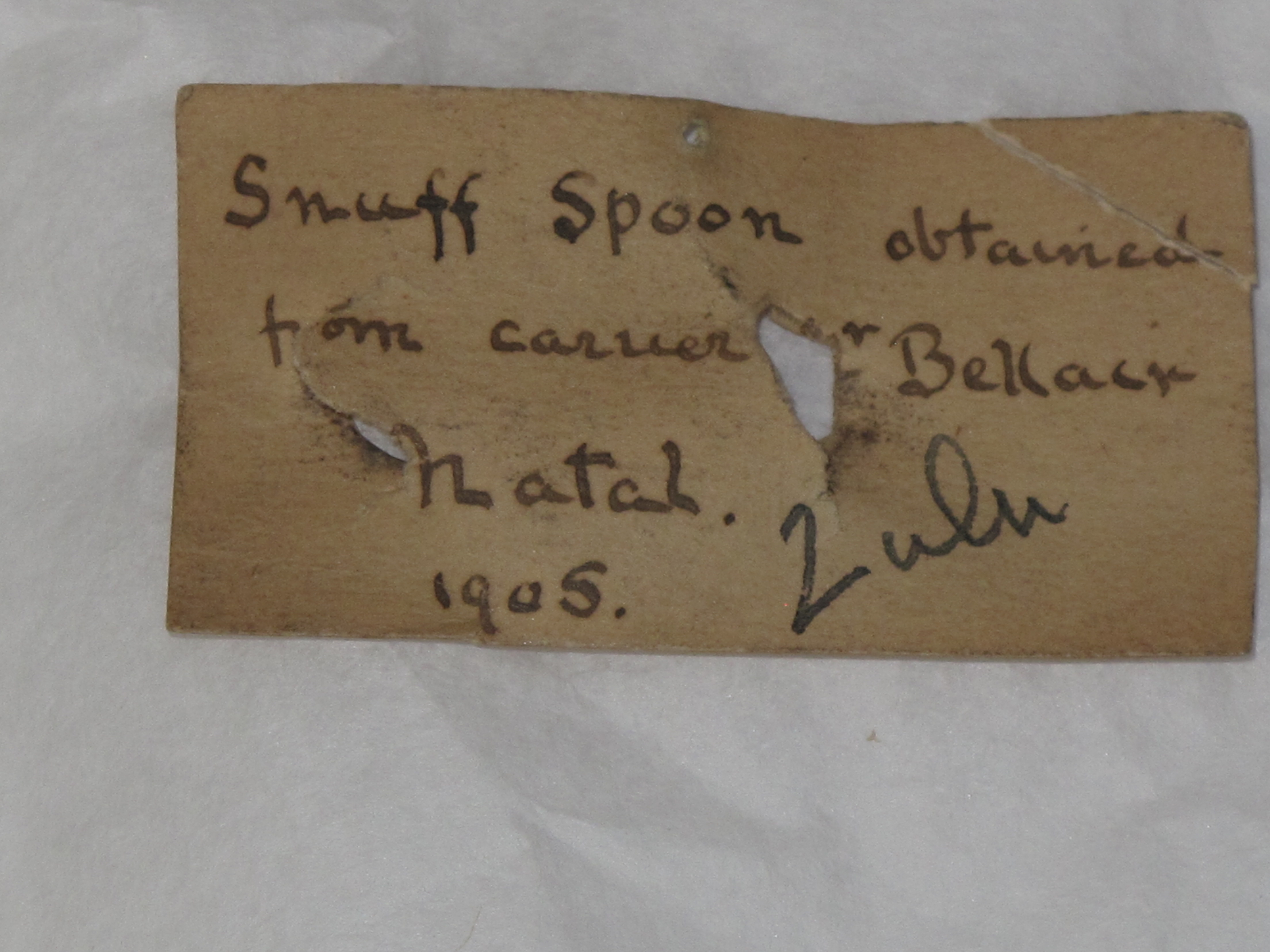 Attributions and conjectures [Source - Nessa Leibhammer for FHYA, 2012, using MAA materials: Names: Spoon - MAA (10/12/2001) Classified: Keyword: Narcotics and Intoxicants; Tools Material: Bone; ?Pigment Descriptions: Bone snuff spoon with black incised lines - MAA (10/12/2001) Local: Maker: Cultural Group: ?Zulu Author: Date Made: Dimensions: 15.2 cm long, 1.8 cm wide, 0.4 cm high Source: Source Date: Place: Africa; Southern Africa; South Africa; Natal; Bellair - MAA (10/12/2001) Africa; Southern Africa; South Africa; KwaZuku; Natal; Bellair - Rachel Hand (29/01/2013) Period: Contexts: Original record not found. This record created from the Accession Register, which notes 'From carver nr Bellair Natal 1905'. Label accompanying object notes 'Snuff spoon obtained/ from carver Nr Bellair/ Natal/ 1905' MAA (10/12/2001) Updated: 26/07/2013 Created: 10/12/2001]