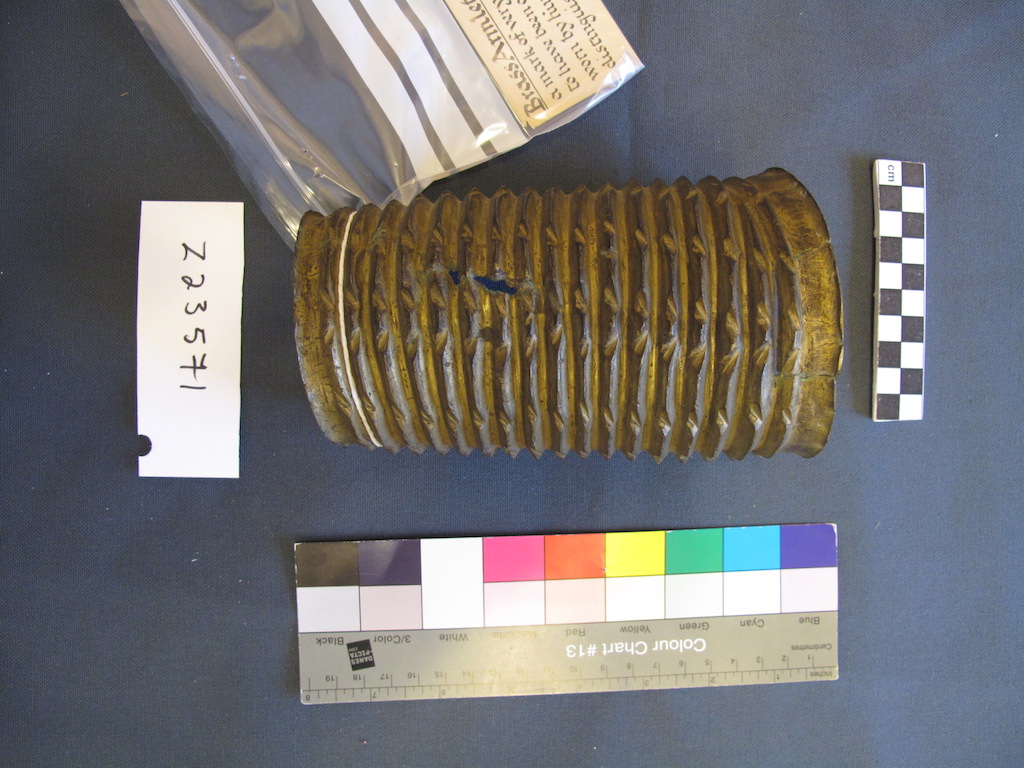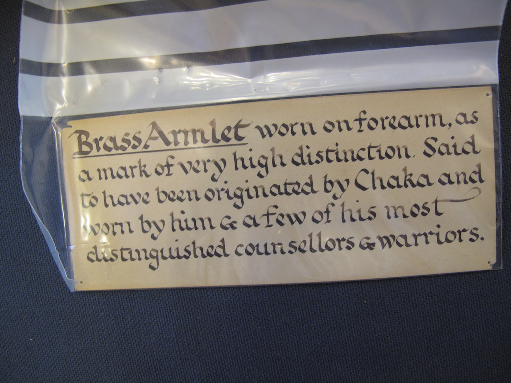 Attributions and conjectures [Source - MAA, 2017: Names: Bracelet Label: "worn on forearm, as a mark of very high distinction. Said to have been originated by Chaka and worn by him and a few of his most distinguished counsellors and warriors." Classified: Keyword: Material: Metal, Brass Descriptions: Bracelet - Large brass armlet of wide cylinder of brass open on one side. Decorated on outside by horizontal grooves - the metal raised between the grooves. Also notches have been cut on these ridges so as to form vertical lines. Label: "worn on forearm, as a mark of very high distinction. Said to have been originated by Chaka and worn by him and a few of his most distinguished counsellors and warriors." Local: Africa; Southern Africa; South Africa Maker: Cultural Group: Zulu Author: Date Made: Dimensions: Source: Unknown]