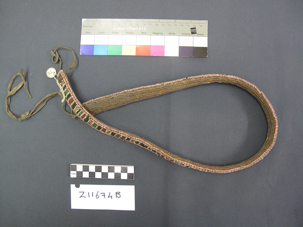 Attributions and conjectures [Source - MAA, 2017: Names: Belt Classified: Keyword: Material: Bead, Grass, Fibre, Metal Descriptions: Belt - Woman's beadwork belt on grass foundation. Vertical stripes of black, red, white and green with pink edging. B: with metal stud. Rachel Hand 10/12/2001'. Local: Maker: Cultural Group: Zulu Author: Date Made: Dimensions: Source: Wootton-Isaacson, Frederick F.J.; Beaumont, Violet (donor) Source Date: Place: Period: Contexts: Source: Formerly owned by F. Wooton-Isaacson esq. (bio) (female donor): Given to Museum by Violet, Lady Beaumont - MAA (15/01/1999) MAA catalogue cards generally misspell Wootton-Isaacson's name. His sister, Lady Violet Beaumont, gave material to the Museum, recorded in the 1848 Annual Report as 'ethnological specimens Pacific Islands, India, China, Japan, and Africa', and also the (Fitzwilliam Museum) in 1948, presumably after his death - Rachel Hand (22/11/2012)]