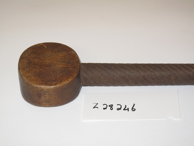 Attributions and conjectures [Source - Nessa Leibhammer for FHYA, 2012, using MAA materials: Names: Club - MAA (15/01/1999) Classified: Keyword: Weapons Material: Wood; Metal Descriptions: Club. Flattish, circular head [?about] 1" thick, 2 1/2" diametre. Shaft 2' long, thin wire decoration bound around it. 'Crack in head'. T. Cotterill, 14/12/2001 - MAA (15/01/1999) Local: Maker: Cultural Group: Author: Date Made: Dimensions: Source: von Hugel (donor) Source Date: 1911 Place: Africa; Southern Africa; South Africa - MAA (15/01/1999) Period: Contexts: (bio) (female donor): Baroness von Hugel - MAA (15/01/1999) Object Notes: This was donated in 1911 by Baroness Von Hugel before her husband's death in 1928. Was she herself a collector? - MAA Updated: 22/07/2008 Created: 15/01/1999]