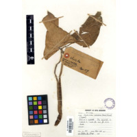 [Source - Chloe Rushovich for FHYA, 2017: File contains organic plant matter identified by Kevin Carnie-Thompson for FHYA using Bews Herbarium material as iNtebe/Stylochiton natalense, photographed together with it's accompanying label, catalogue card, 10cm scale bar and a colour reference grid.]