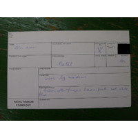 [Source - Chloe Rushovich for FHYA, 2018: File contains object identified by FHYA using KZNM materials as a 'loin dress', a label, a catalogue card, and relevant accession record material.]