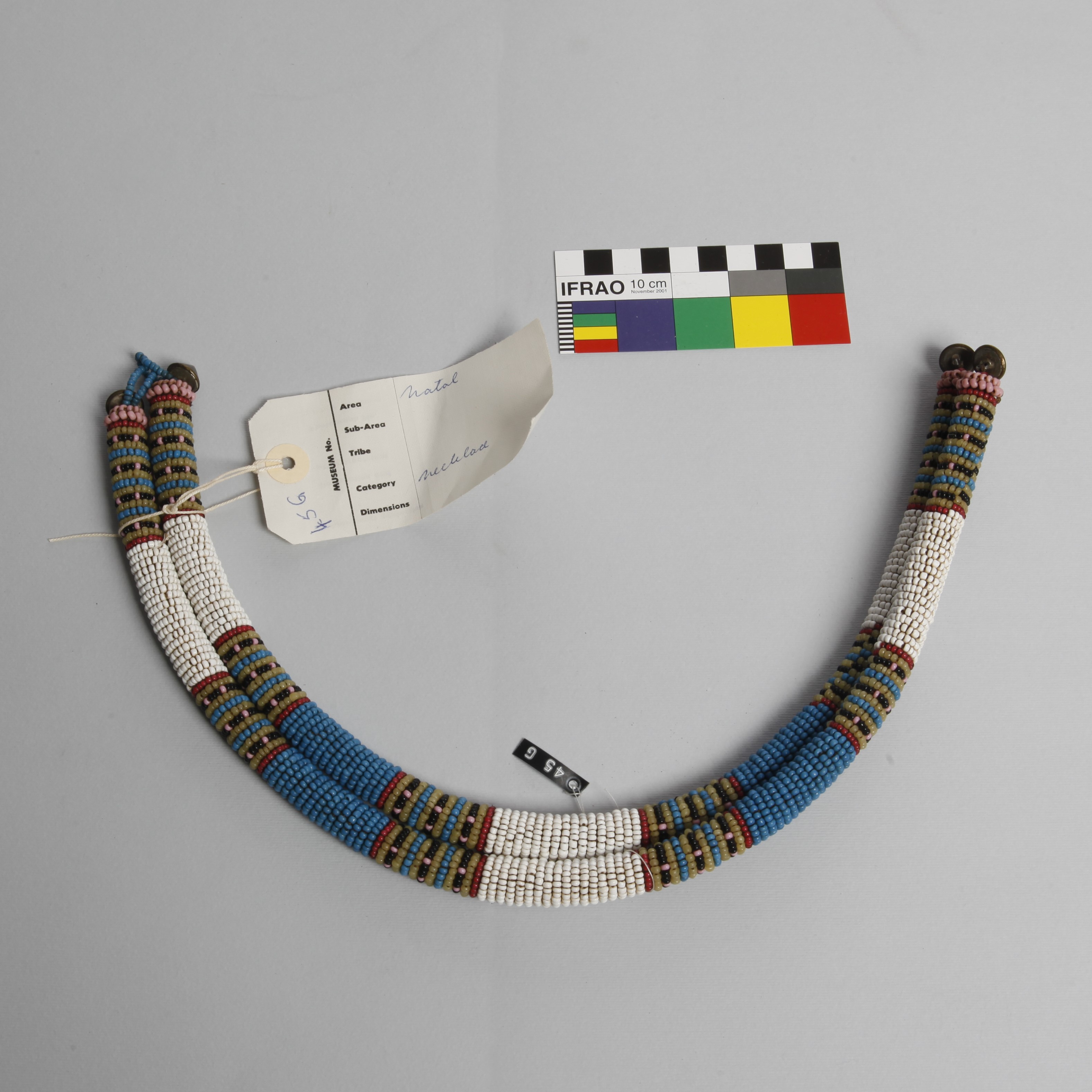 [Source - Chloe Rushovich for FHYA, 2020, transcription of KwaZulu-Natal Museum database extracts: Entry in the Accessions Register (Ethnology Book 1): "Native maiden's complete costume - present = beadwork (necklaces, loin cover X 2)". Six articles possibly making a complete outfit (originally A-H; F is missing).]