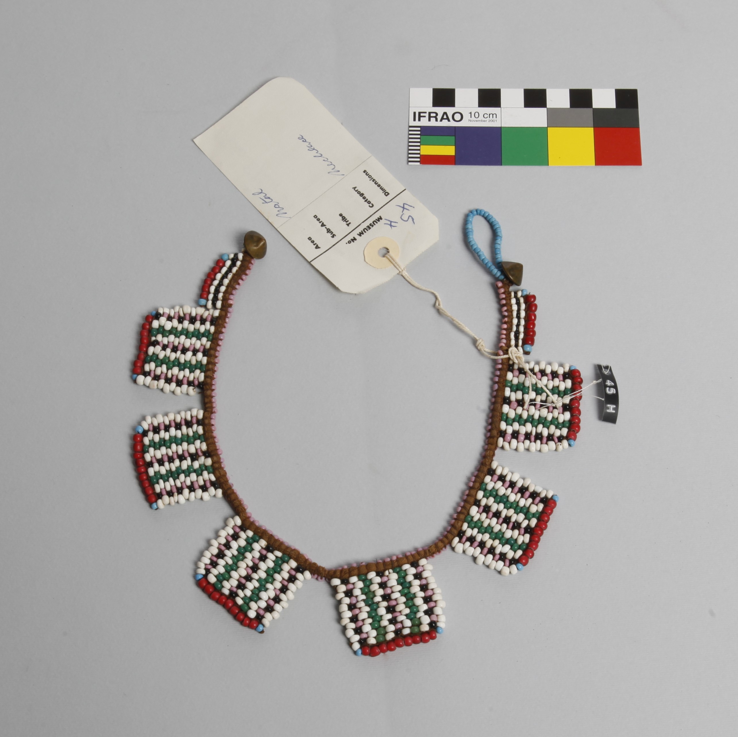 [Source - Chloe Rushovich for FHYA, 2020, transcription of KwaZulu-Natal Museum database extracts: Entry in the Accessions Register (Ethnology Book 1): "Native maiden's complete costume - present = beadwork (necklaces, loin cover X 2)". Six articles possibly making a complete outfit (originally A-H; F is missing).]