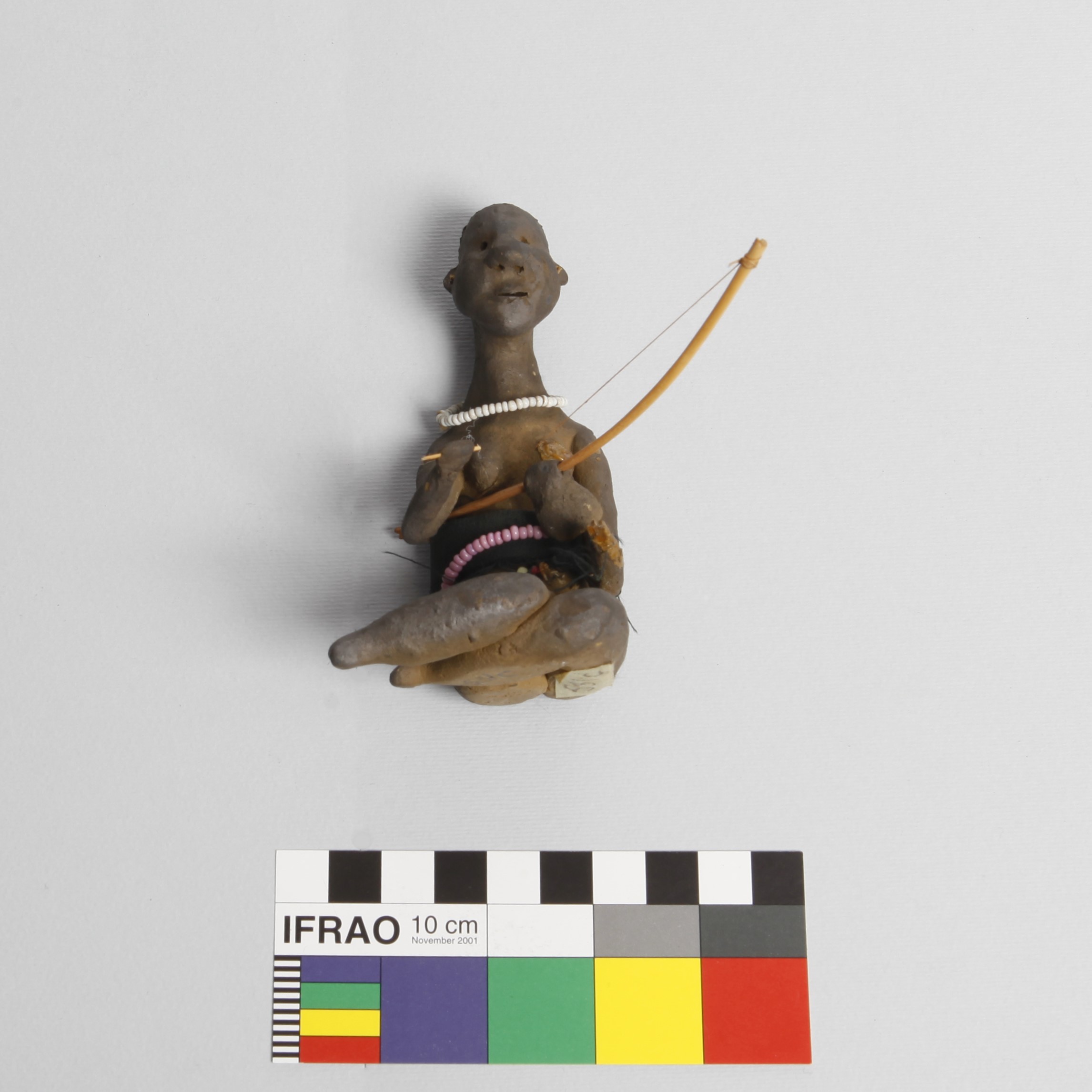KZNM metadata [Source - Chloe Rushovich for FHYA, 2016, using KwaZulu Natal Museum Catalogue Card: Cultural Affinity: Zulu Provenance: Edendale, Natal Function: Girl holding musical bow and stick Raw materials: Clay, beads Comments: Work of a Zulu girl, slightly damaged. See card 531. May 1995 - playing stick very broken Method Obtained: Pur - Rev. Father Mayr 1906.]