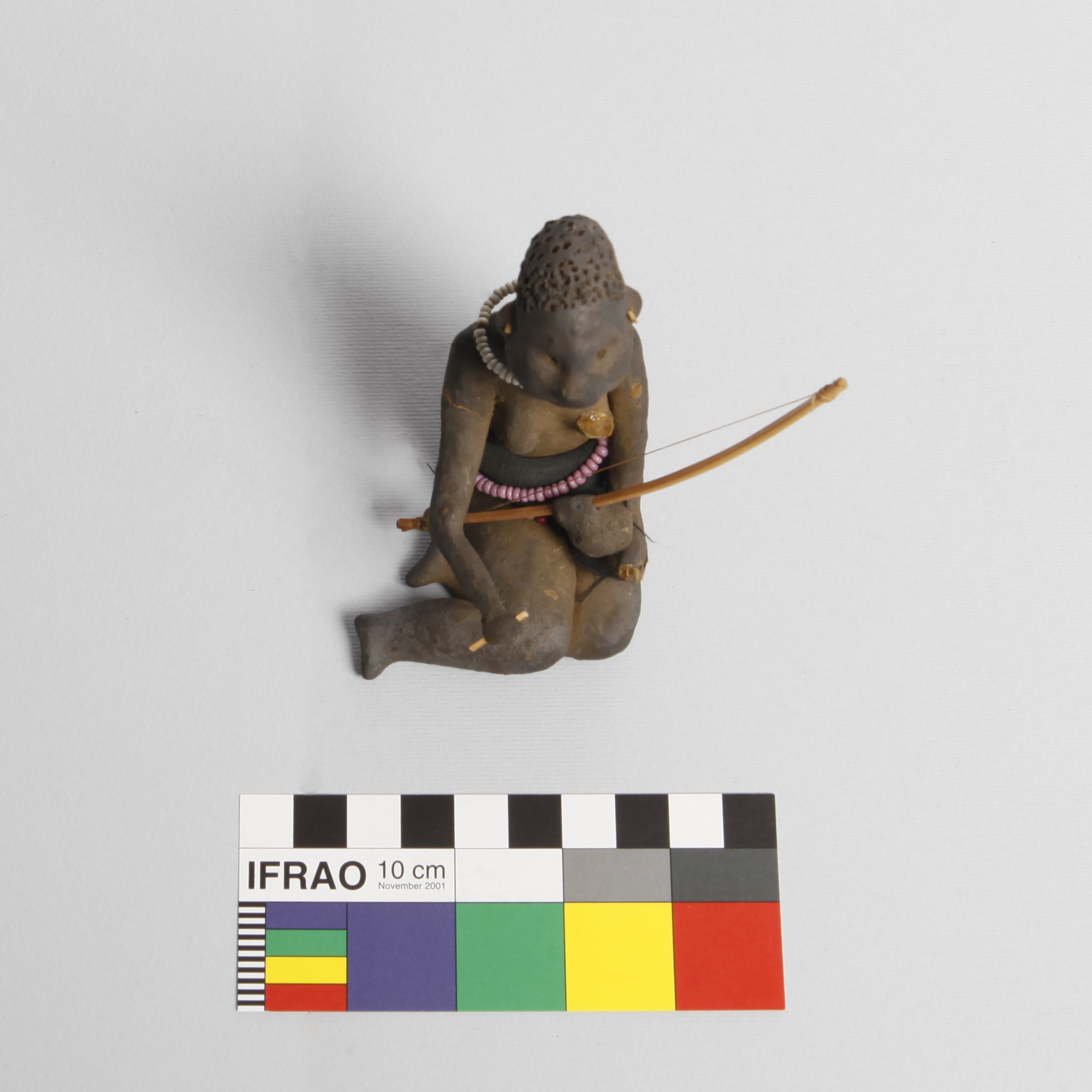 Additional information [Source - Chloe Rushovich for FHYA, 2020, transcription of KwaZulu-Natal Museum object detail catalogue material: Collection: Anthropology Accession #: 00531 Othername: Clay model Received as: Unknown Received date: 1906 Catalogued by: Frederick W. Fitzsimons Source: Franz Mayr Description: Belonging to a set of clay models. Catalogue card: "girl holding musical bow & stick". instrument broken off People: Mayr, Franz Material: clay, beads Provenance: Accessions register: Locality: "Edendale, Natal".]