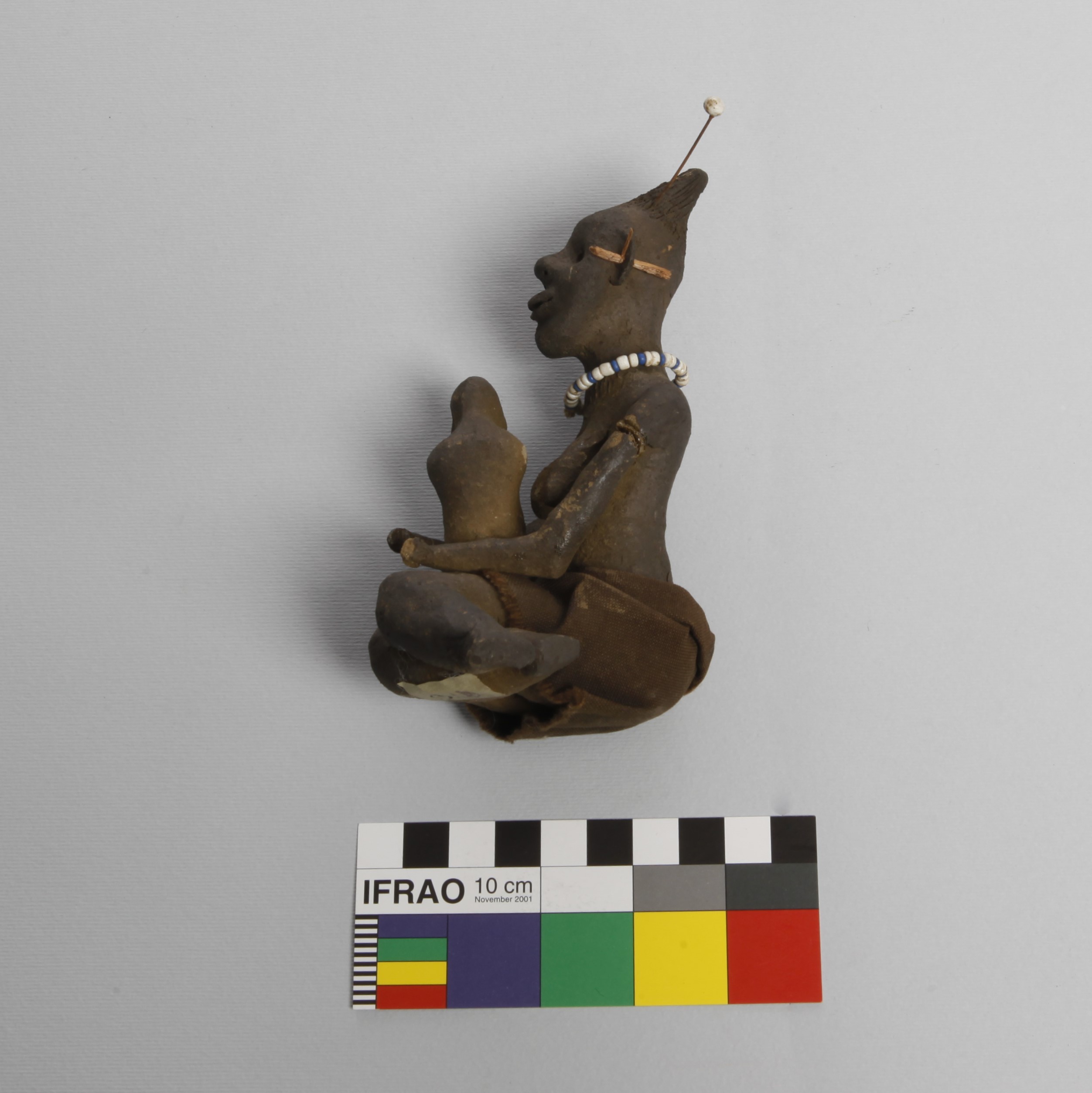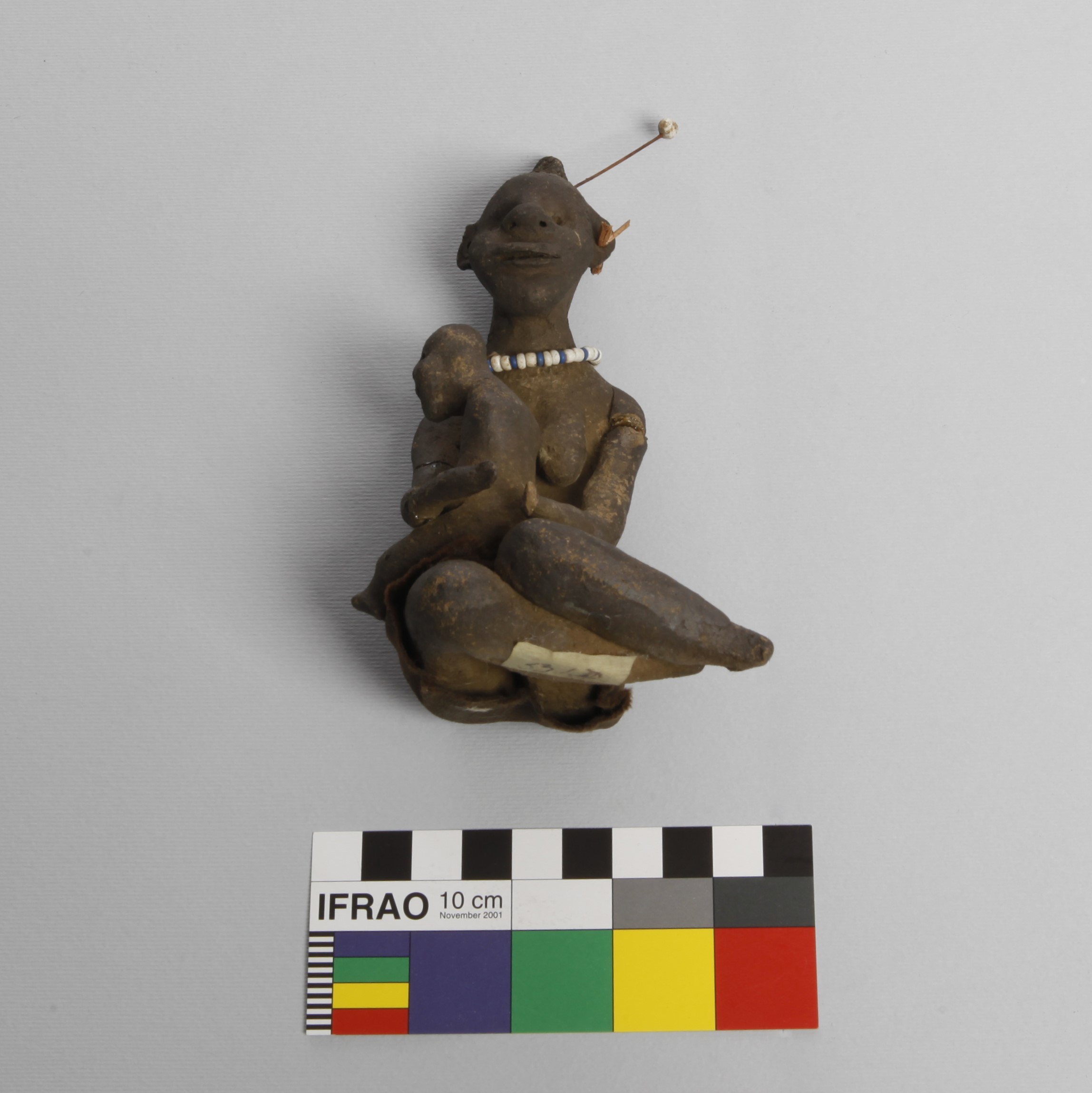 Additional information [Source - Chloe Rushovich for FHYA, 2020, transcription of KwaZulu-Natal Museum object detail catalogue material: Collection: Anthropology Accession #: 00531 Othername: Clay model Received as: Unknown Received date: 1906 Catalogued by: Frederick W. Fitzsimons Source: Franz Mayr Description: Belonging to a set of clay models. Catalogue card: "woman holding a baby, Has top knot". beaded necklace, arms glued back together People: Mayr, Franz Material: clay Provenance: Accessions register: Locality: "Edendale, Natal".]