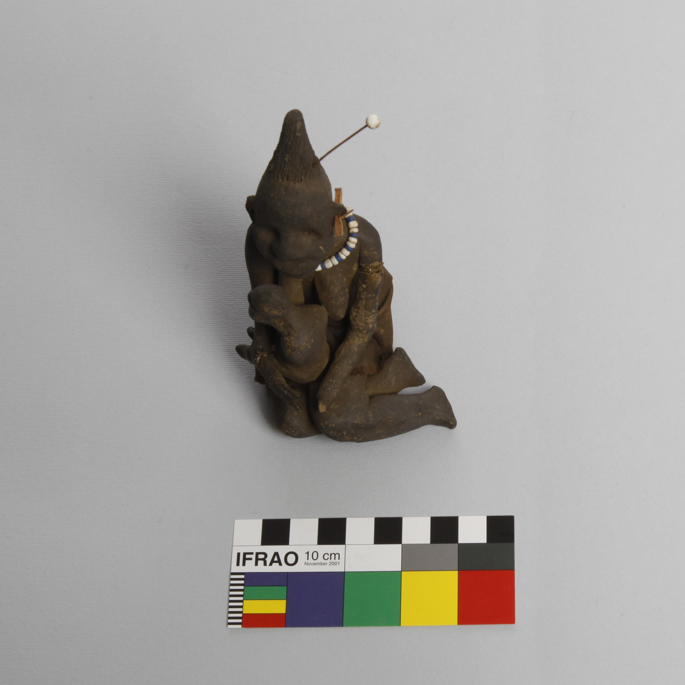 KZNM metadata [Source - Chloe Rushovich for FHYA, 2016, using KwaZulu Natal Museum Catalogue Card: Cultural Affinity: Zulu Provenance: Edendale, Natal Function: Woman holding baby. Has top knot Raw materials: Clay Comments: Work of a Zulu girl, one arm damaged. See card 531 Method Obtained: Pur - Rev. Father Mayr 1906.]