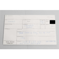 [Source - Chloe Rushovich for FHYA, 2018: File contains object identified by FHYA using KZNM materials as a 'model', a catalogue card, and relevant accession record material.]