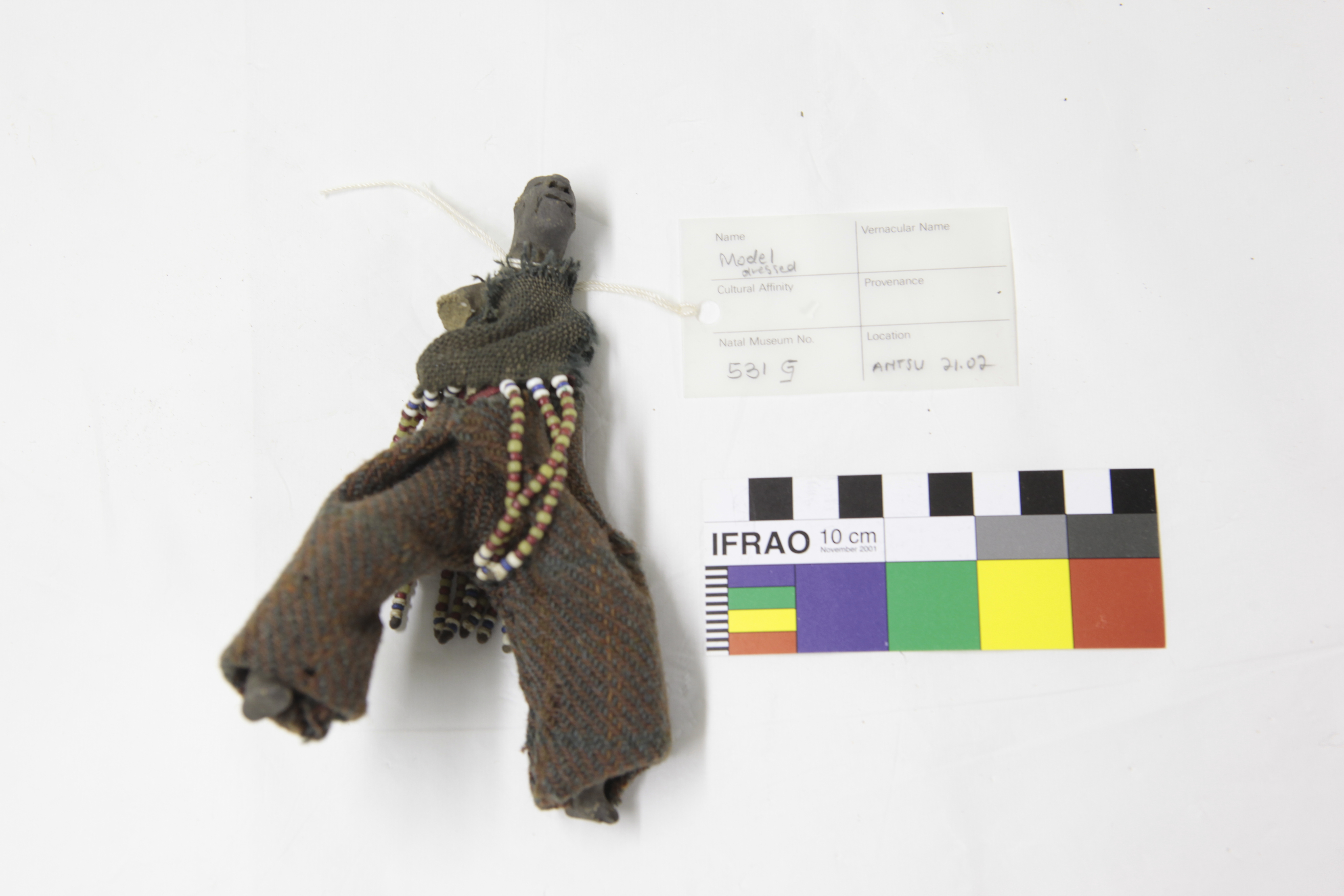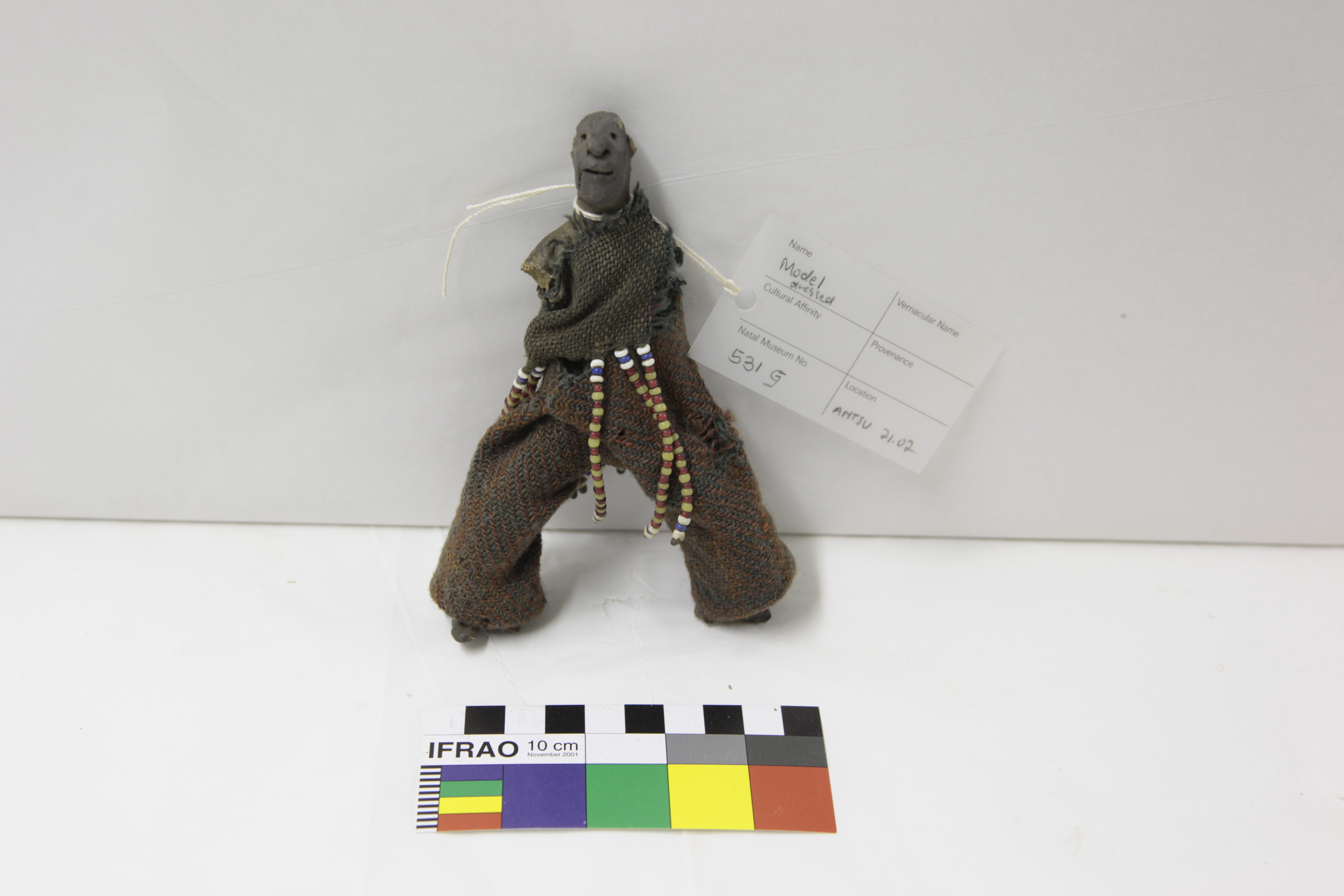 Additional information [Source - Chloe Rushovich for FHYA, 2020, transcription of KwaZulu-Natal Museum object detail catalogue material: Collection: Anthropology Accession #: 00531 Othername: Clay model Received as: Unknown Received date: 1906 Catalogued by: Frederick W. Fitzsimons Source: Franz Mayr Description: Belonging to a set of clay models. Catalogue card: "man in trousers + blanket, legs astride, remains of some sort of weapon in right hand". People: Mayr, Franz Archival history: DT&JW 2019/05/27: Identified as a duplicate number in 2017/8 audit. We checked the full object sequence and added the suffix G to this item because the card catalogue description fits. Material: Clay, fabric Provenance: Accessions register: Locality: "Edendale, Natal".]