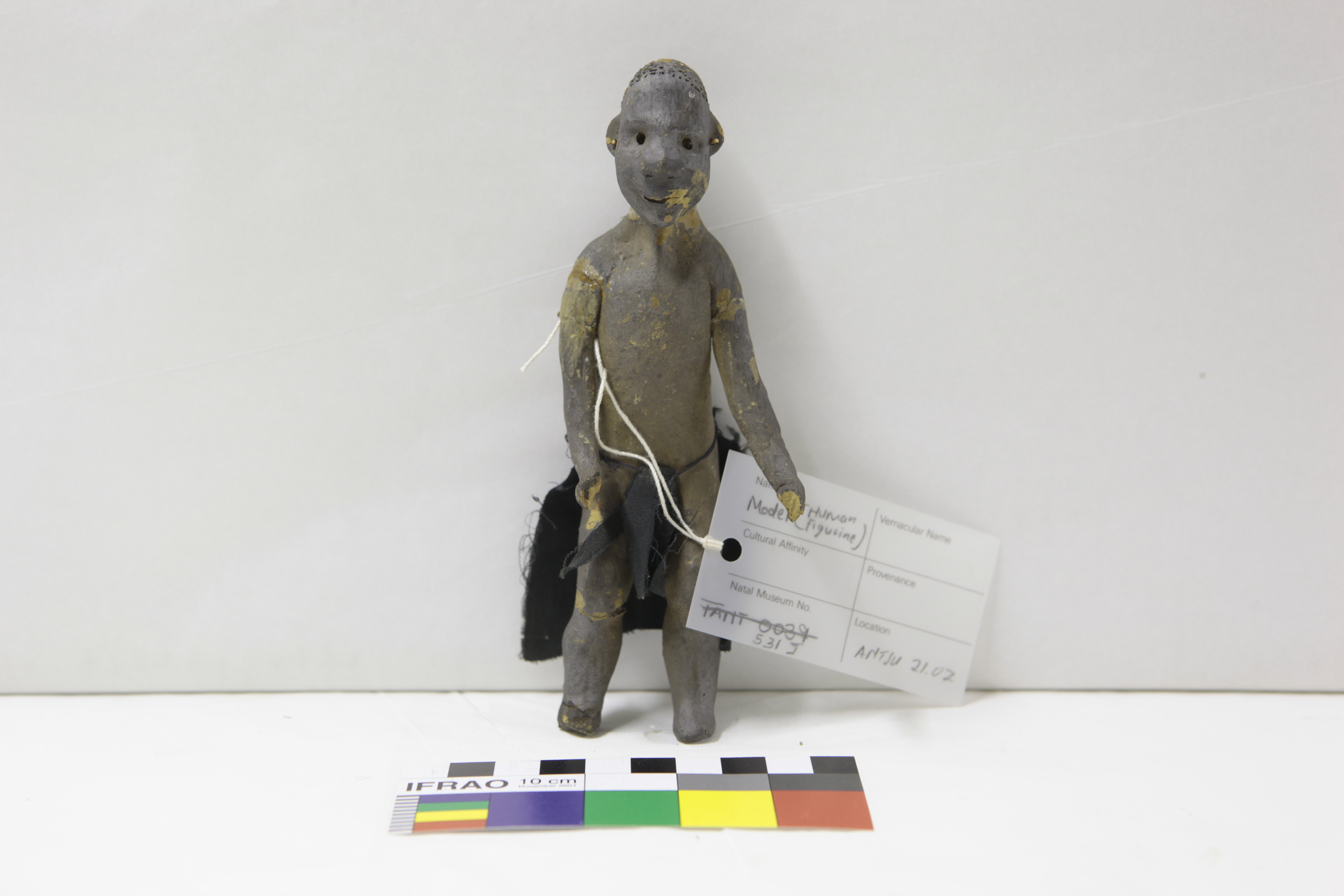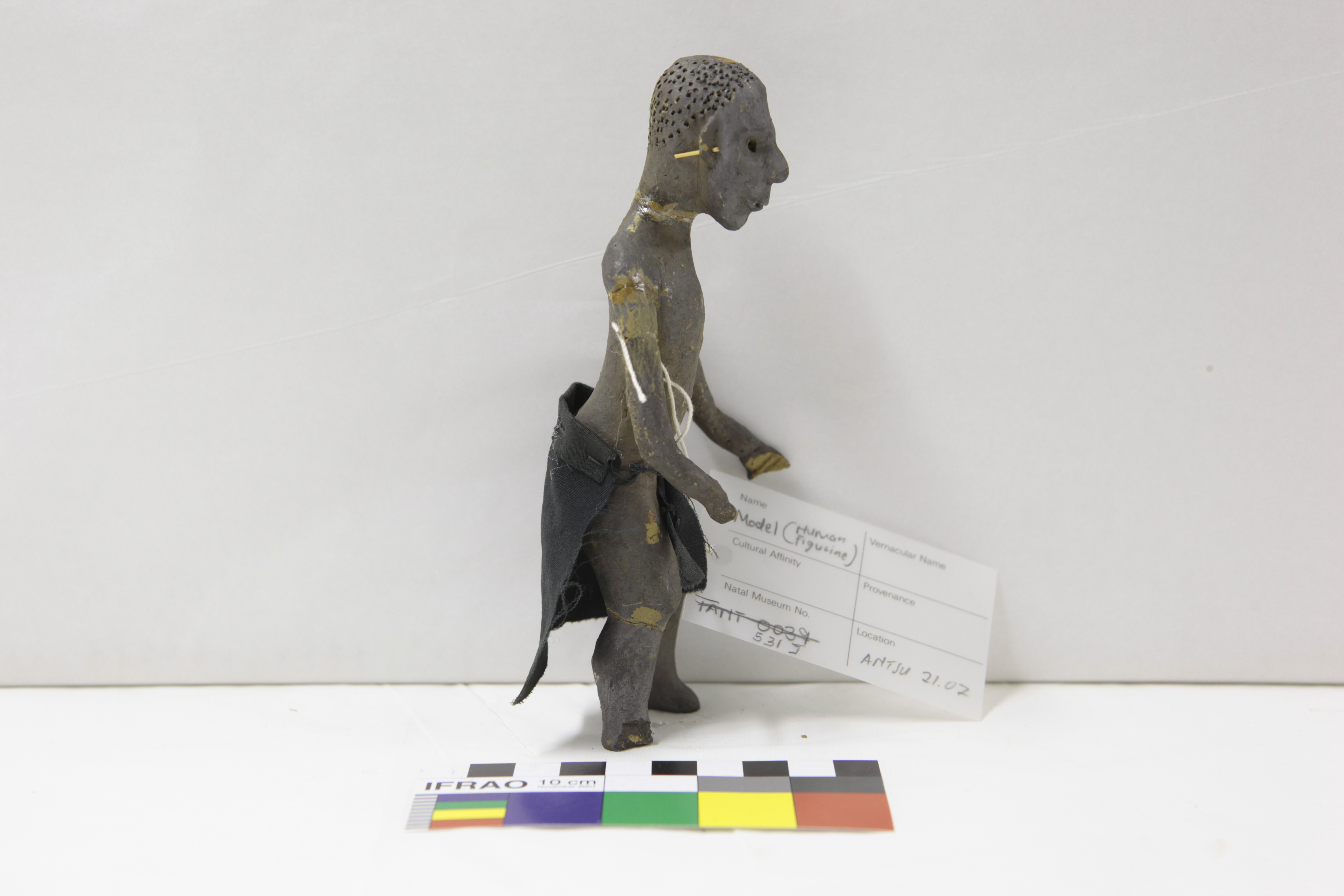 Additional information [Source - Chloe Rushovich for FHYA, 2020, transcription of KwaZulu-Natal Museum object detail catalogue material: Collection: Anthropology Accession #: 00531 Othername: Clay model Received as: Unknown Received date: 1906 Catalogued by: Frederick W. Fitzsimons Source: Franz Mayr Description: Belonging to a set of clay models. Catalogue card: "man, stick in left hand, stick plugs in ears, cloth umutsha (ibeshu + isinene)". Formerly holding a walking stick, hands broken and walking stick missing. People: Mayr, Franz Archival history: DT&JW 2019/05/27: Given a temporary number in 2017/8 audit (TANT0039). We identified this as belonging to the set of objects under 531 and allocated the suffix J to this item because the card catalogue description fits. Material: Clay, cloth Provenance: Accessions register: Locality: "Edendale, Natal".]