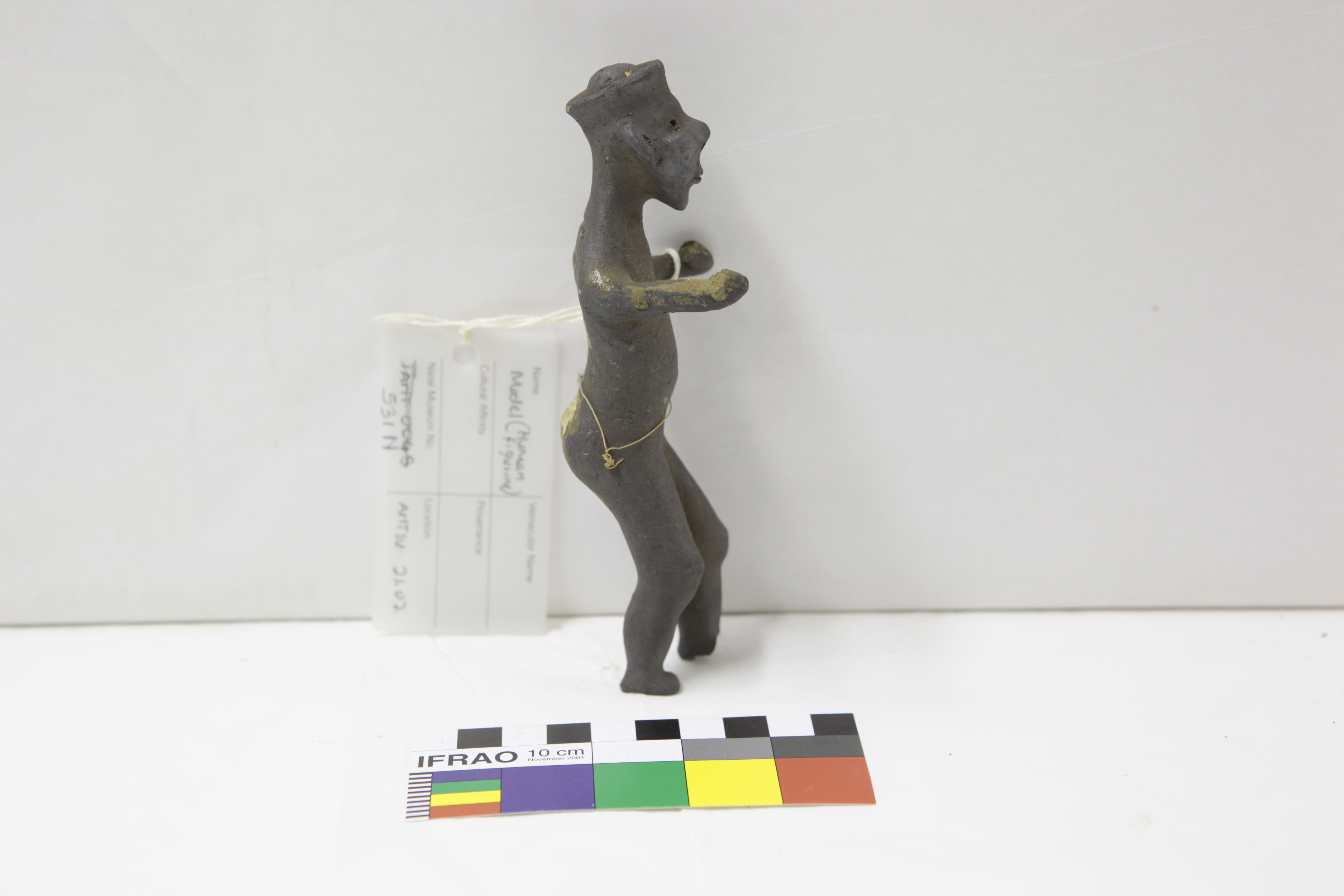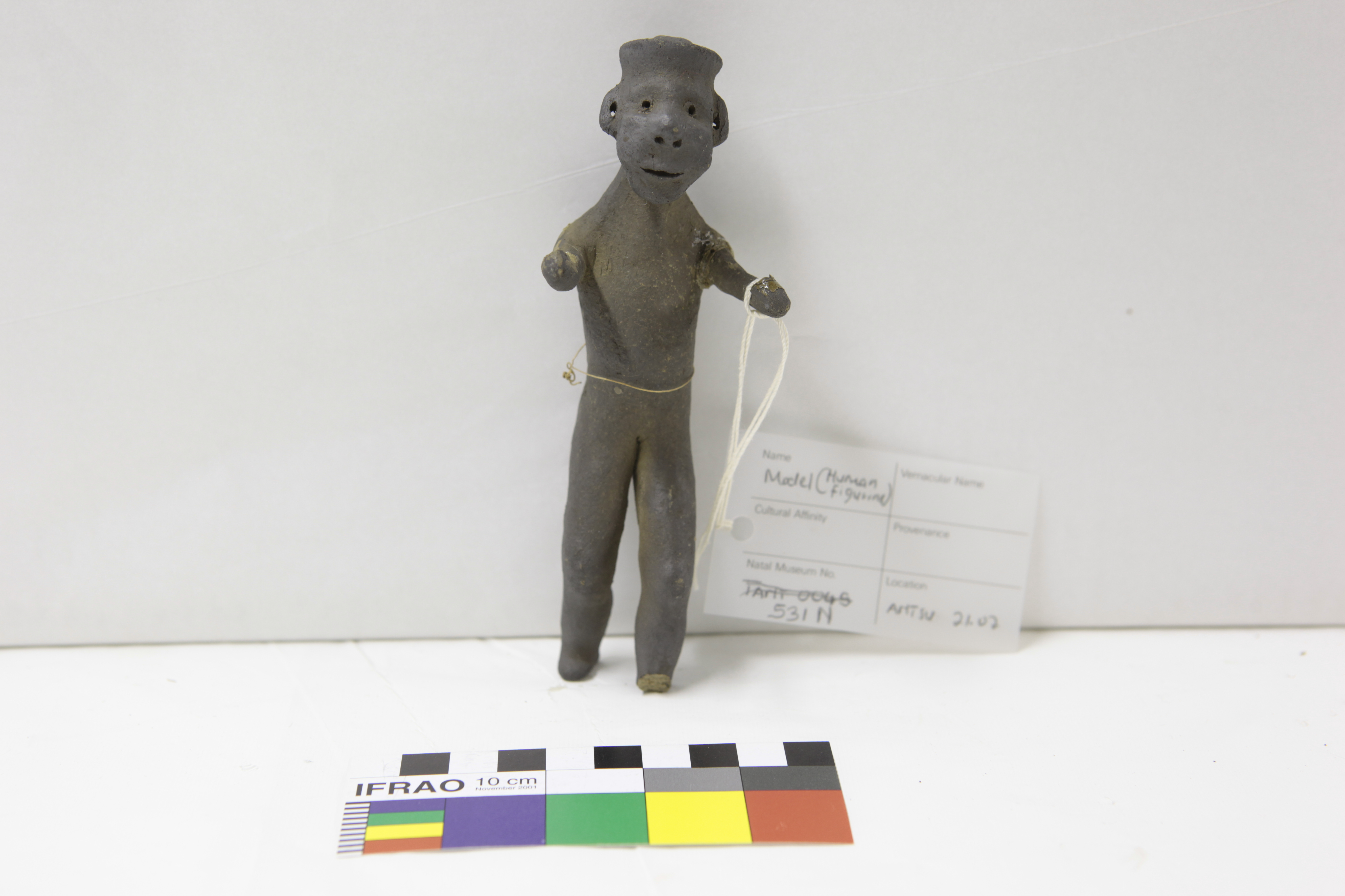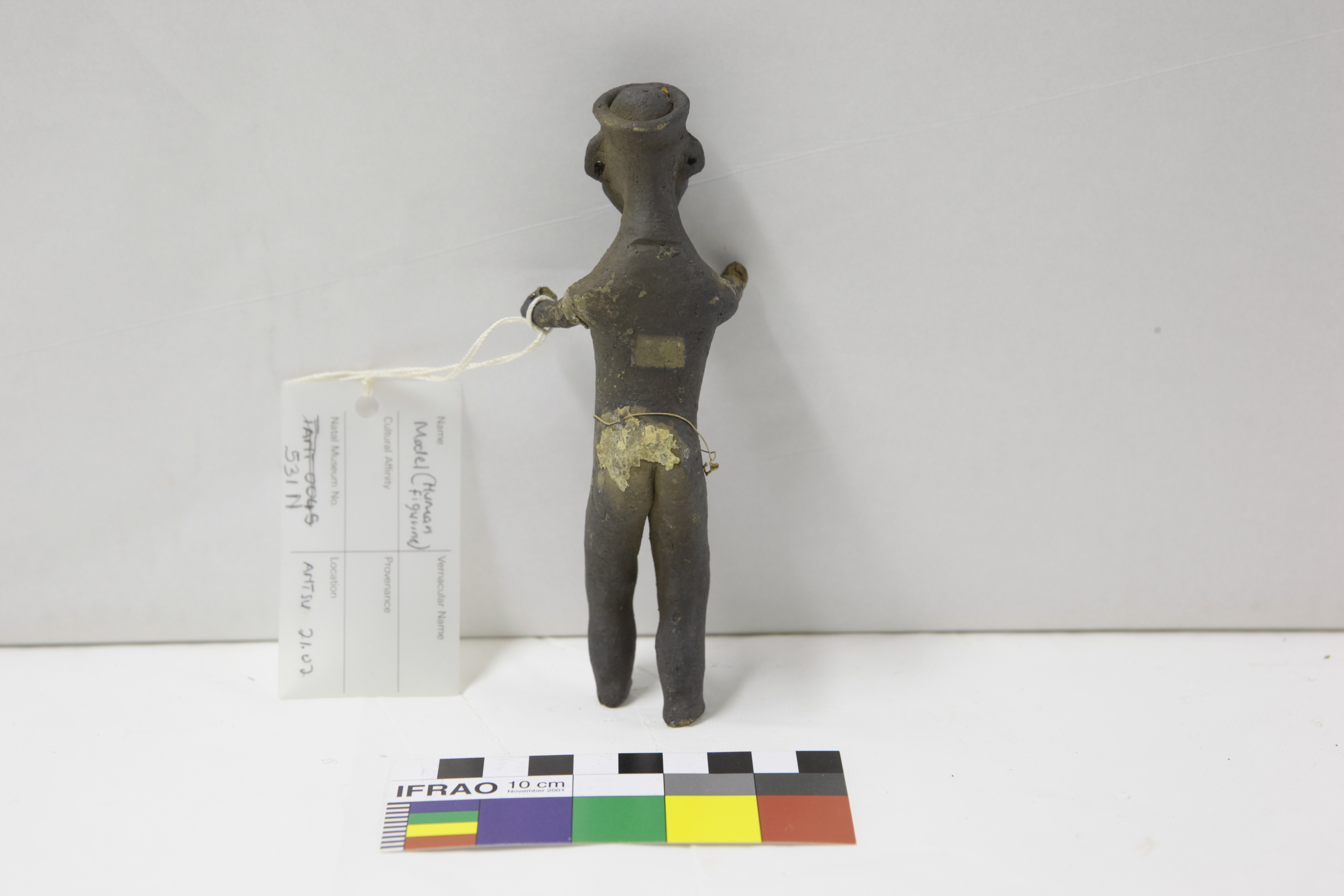 Additional information [Source - Chloe Rushovich for FHYA, 2020, transcription of KwaZulu-Natal Museum object detail catalogue material: Collection: Anthropology Accession #: 00531 Othername: Clay model Received as: Unknown Received date: 1906 Catalogued by: Frederick W. Fitzsimons Source: Franz Mayr Description: Belonging to a set of clay models. Catalogue card: "Zulu man - head ring, has ear lobe holes". Standing, arms and left foot broken. People: Mayr, Franz Archival history: DT&JW 2019/05/27: Given a temporary number in 2017/8 audit (TANT0045). We identified this as belonging to the set of objects under 531 and allocated the suffix N to this item because the catalogue card description fits. Material: Clay, cloth Provenance: Accessions register: Locality: "Edendale, Natal".]