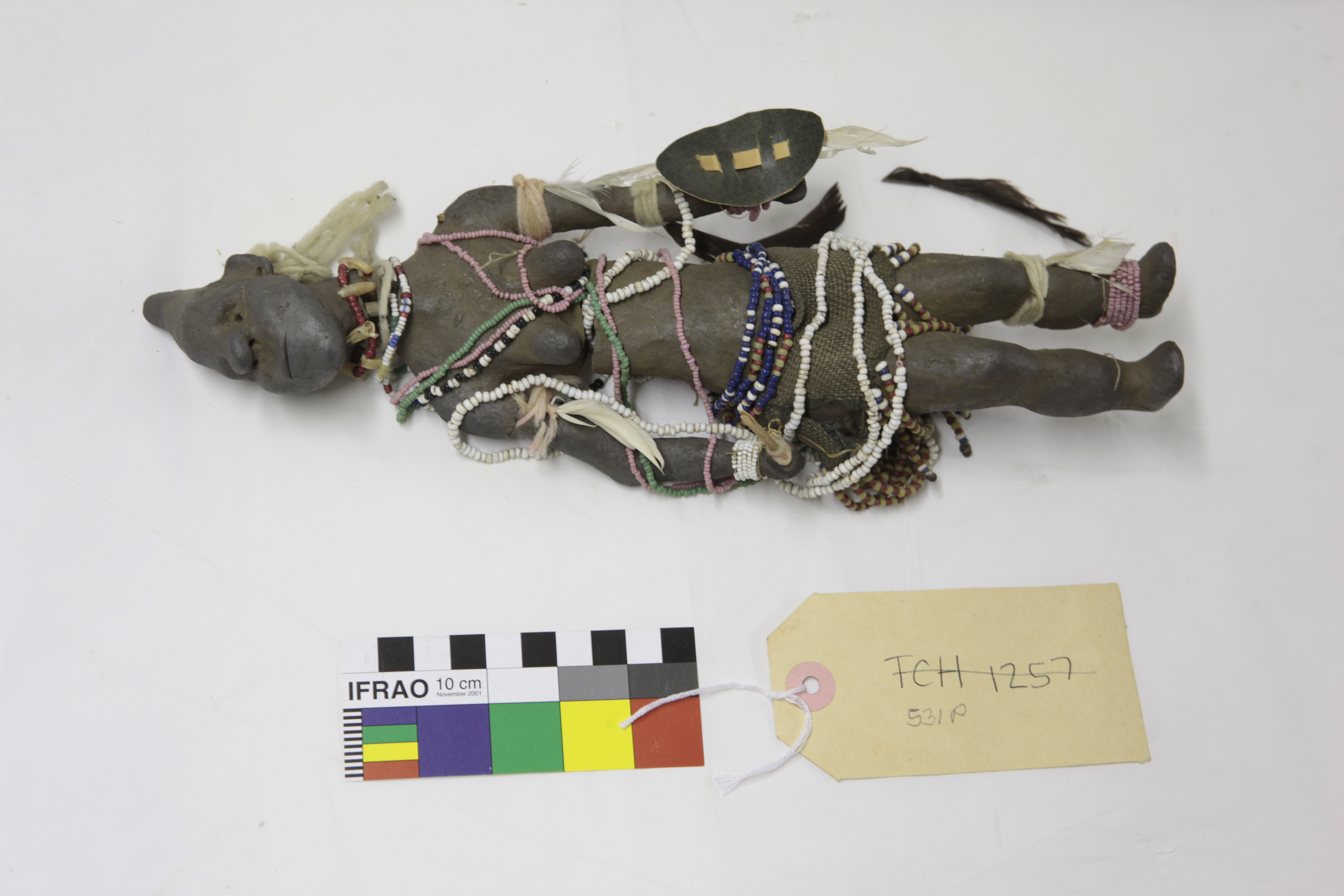 Additional information [Source - Chloe Rushovich for FHYA, 2020, transcription of KwaZulu-Natal Museum object detail catalogue material: Collection: Anthropology Old #: 531, TCH1257 Accession #: 00531 Othername: Clay model Received as: Unknown Received date: 1906 Catalogued by: Frederick W. Fitzsimons Source: Franz Mayr Description: Belonging to a set of clay models. New catalogue prepared 04/10/2019: Woman, possibly marriagable young woman, wearing numerous strands of beads (pink, white, green, blue, red, yellow, black). One necklace around her neck made of red beads and claws. Also decorated with feathers, strings tied around her arms and left leg, cloth apron, right hand holding a stick. Breakages at neck and torso. People: Mayr, Franz Archival history: DT + JW (04/10/2019): This object was found in the History collection and allocated a new number in the 531 sequence, because it has the number painted under its left foot (looks like an old label). We have given it the number 00531P. Material: Clay, beads, string, cloth, sticks, claws. Provenance: Accessions register: Locality: "Edendale, Natal".]