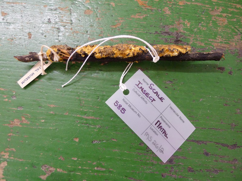 [Source - Chloe Rushovich for FHYA, 2020, transcription of KwaZulu-Natal Museum database extracts: Accessions Register (Ethnology Book 1): "Scale insect used for making the black wax-like ring of the (Isicoco[underlined]). The scale insects are pressed into a ball + heated on a pan over a fire mixed with sap from (Um-Bodiya[underlined]) roots (a small plant by rivers). The scale insect occurs on the shrub (Upandhlazi[underlined] or Umzungulu[underlined]) (Dalbergia obovata (?). Sticky base (Ungiyane[underlined])".]