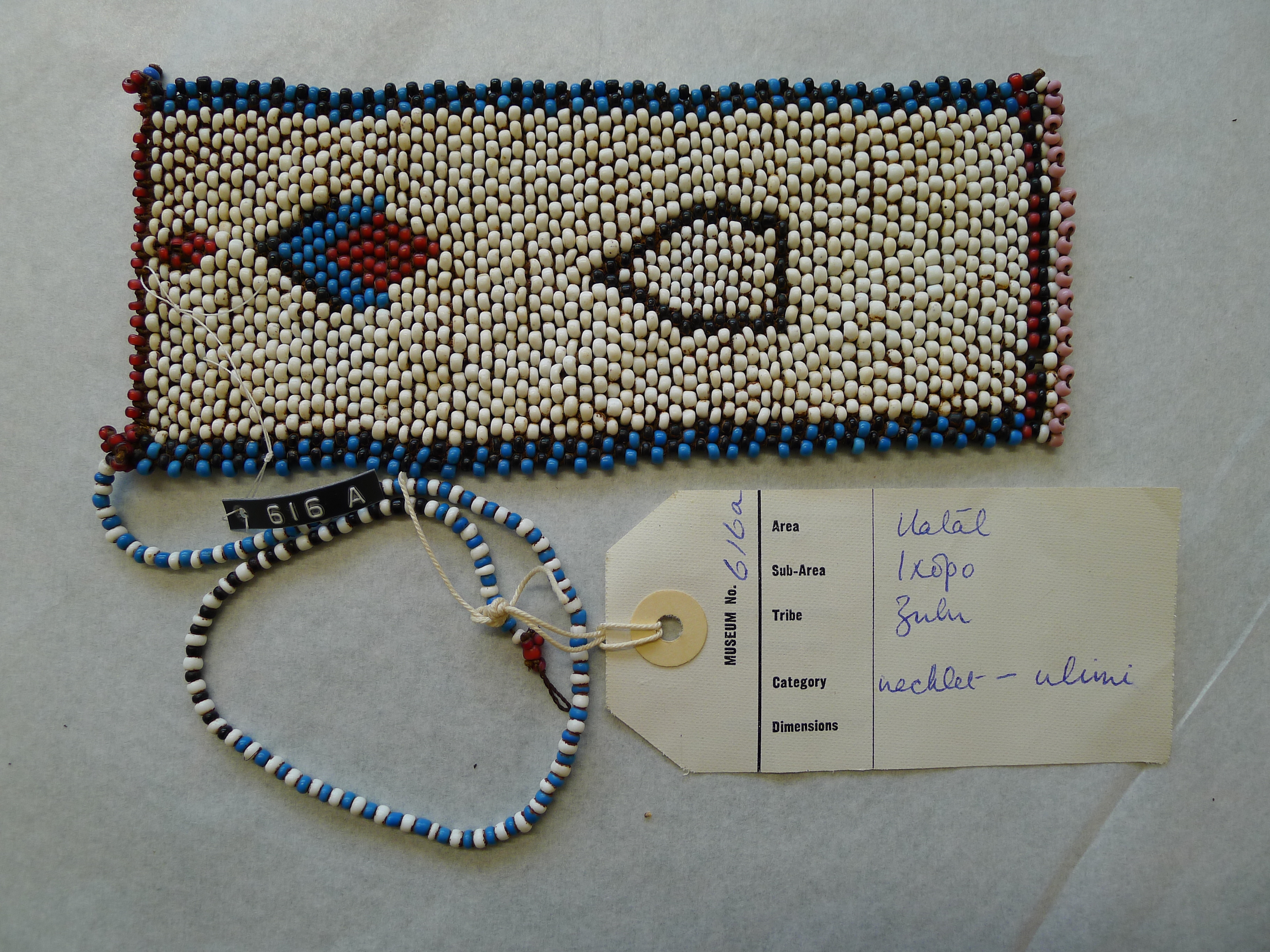 [Source - Chloe Rushovich for FHYA, 2020, transcription of KwaZulu-Natal Museum database extracts: Entry in the Accessions Register (Ethnology Book 1) for Accession 616: "Zulu necklet (ulimi)". Next to this Accession is written: "Moved from Nos 48/49 - 3 specimens": Entry in the Accessions Register (Ethnology Book 1) for Accession 48: "Native bead necklet of various patterns". Next to this listing is written: "Cancelled see Nos 616 & 690". Entry in the Accessions Register (Ethnology Book 1) for Accession 49: "Native bead anklet". So Accession Numbers 48, 49, 616 and 690 are entangled in some way (see notes). Entry in the Accessions Register (Ethnology Book 1) for Accession 690: "Zulu necklaces constituting a letter. Zulu name Umampapeni. - not in dictionary [later addition in a different handwriting]. (The idea of the cross was attained from the Red Cross on hospital trains and wagons.)."]